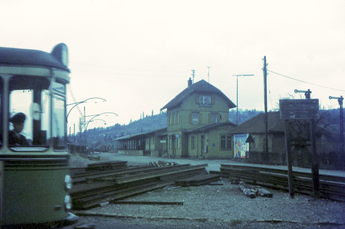 Straßenbahn Reutlingen__Der Südbhf. mit Front eines T2 auf Linie 1.__24.06.1970