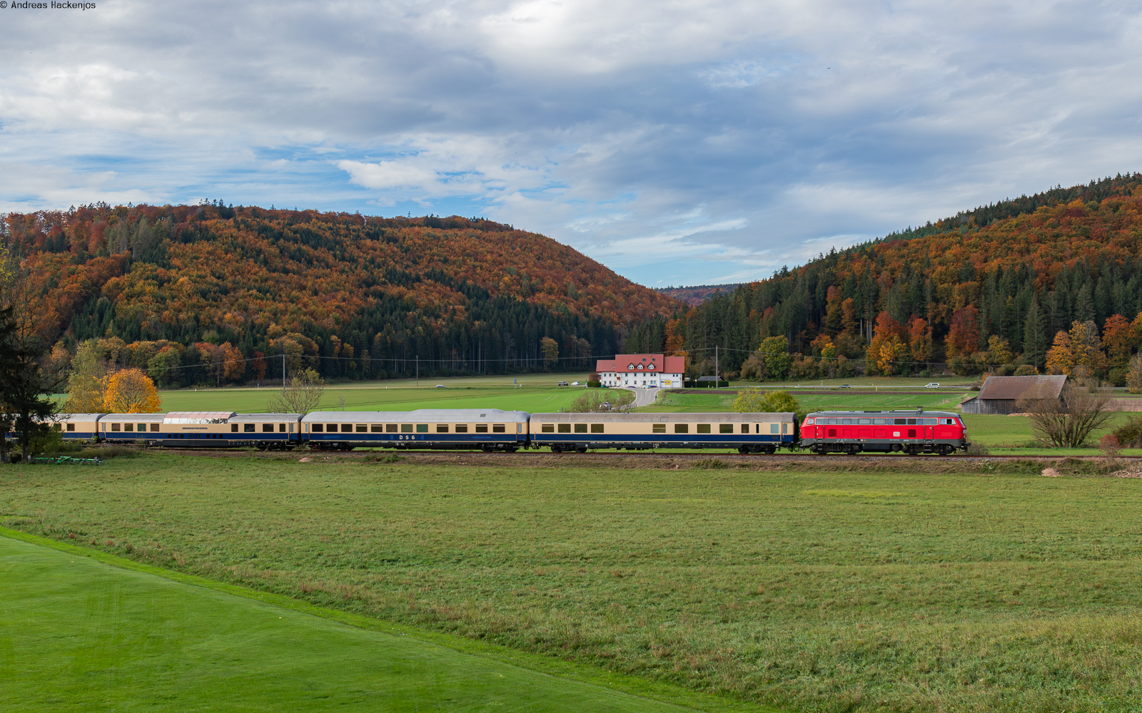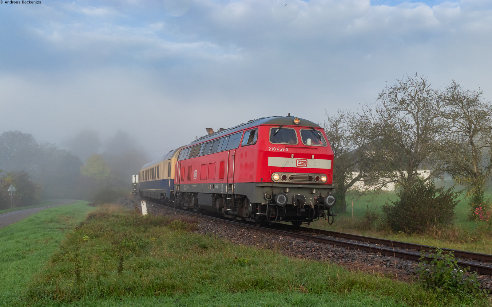 218 451 mit einem Sonderzug für Filmaufnahmen im Bf Fützen 17.10.24. Das Bild entstand vom Bahnsteig