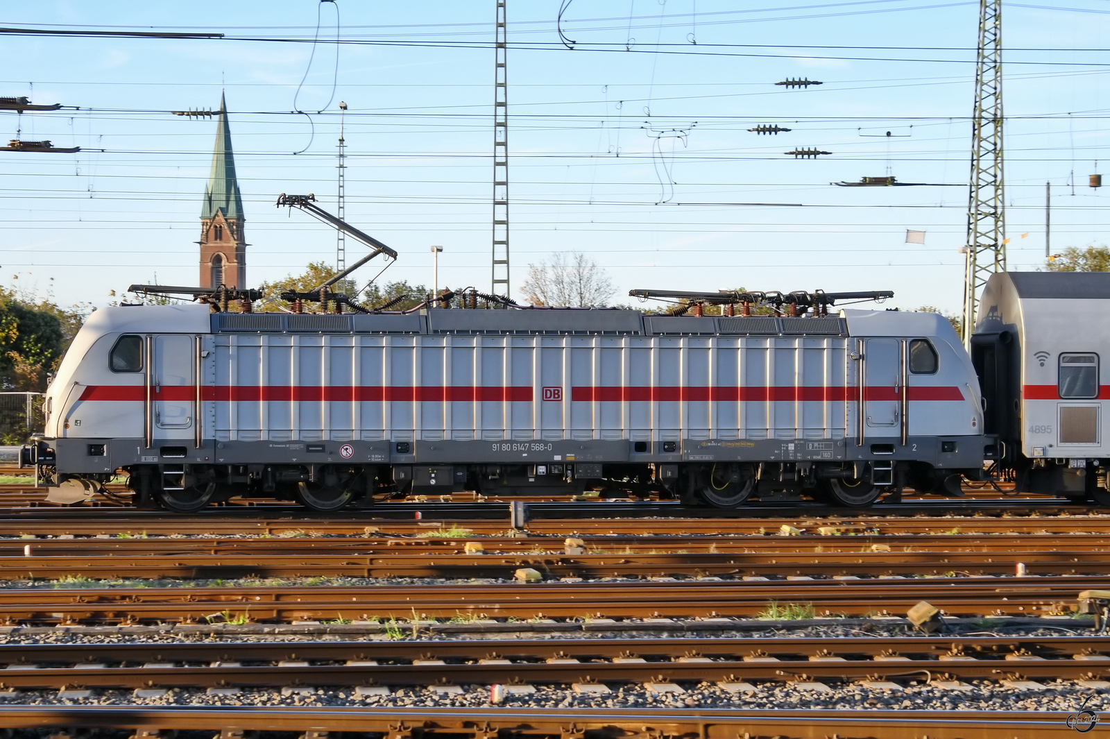 Die Elektrolokomotive 147 568-0 zieht eine IC2-Garnitur, so gesehen Ende Oktober 2024 am Hauptbahnhof in Dortmund.