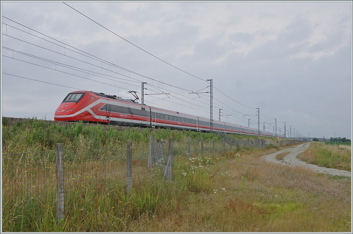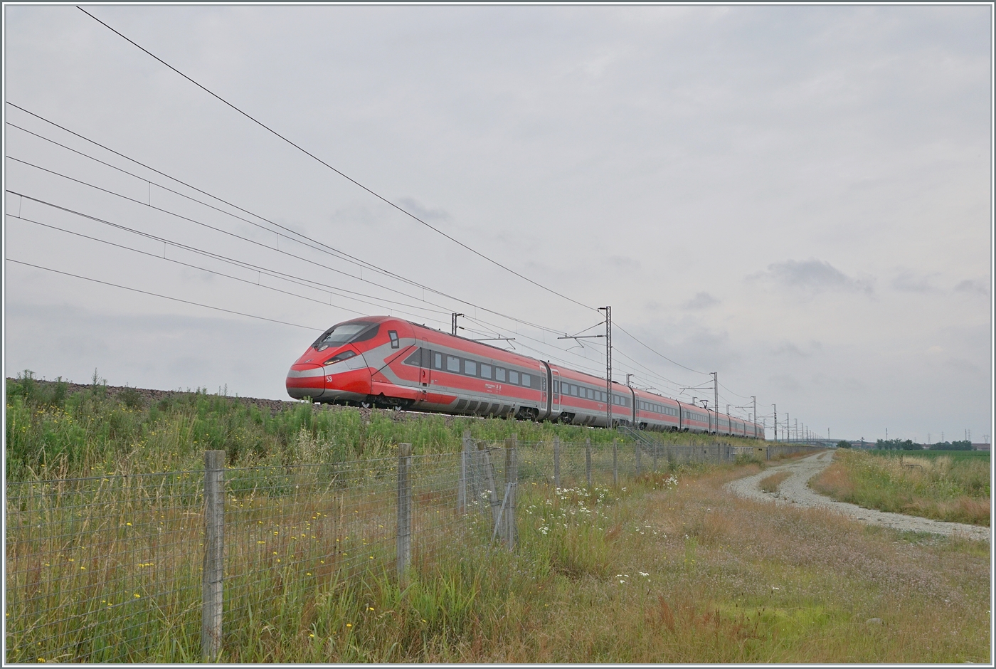 Kurz darauf erreichte in schneller Fahrt der FS Trenitlaia ETR 500 in der ursprünglichen Frecciarossa Lackierung meine Fotostelle bei Livorno Ferraris. Der Zug ist als Frecciarossa 9904 von Roma Termini nach Torino unterwegs.