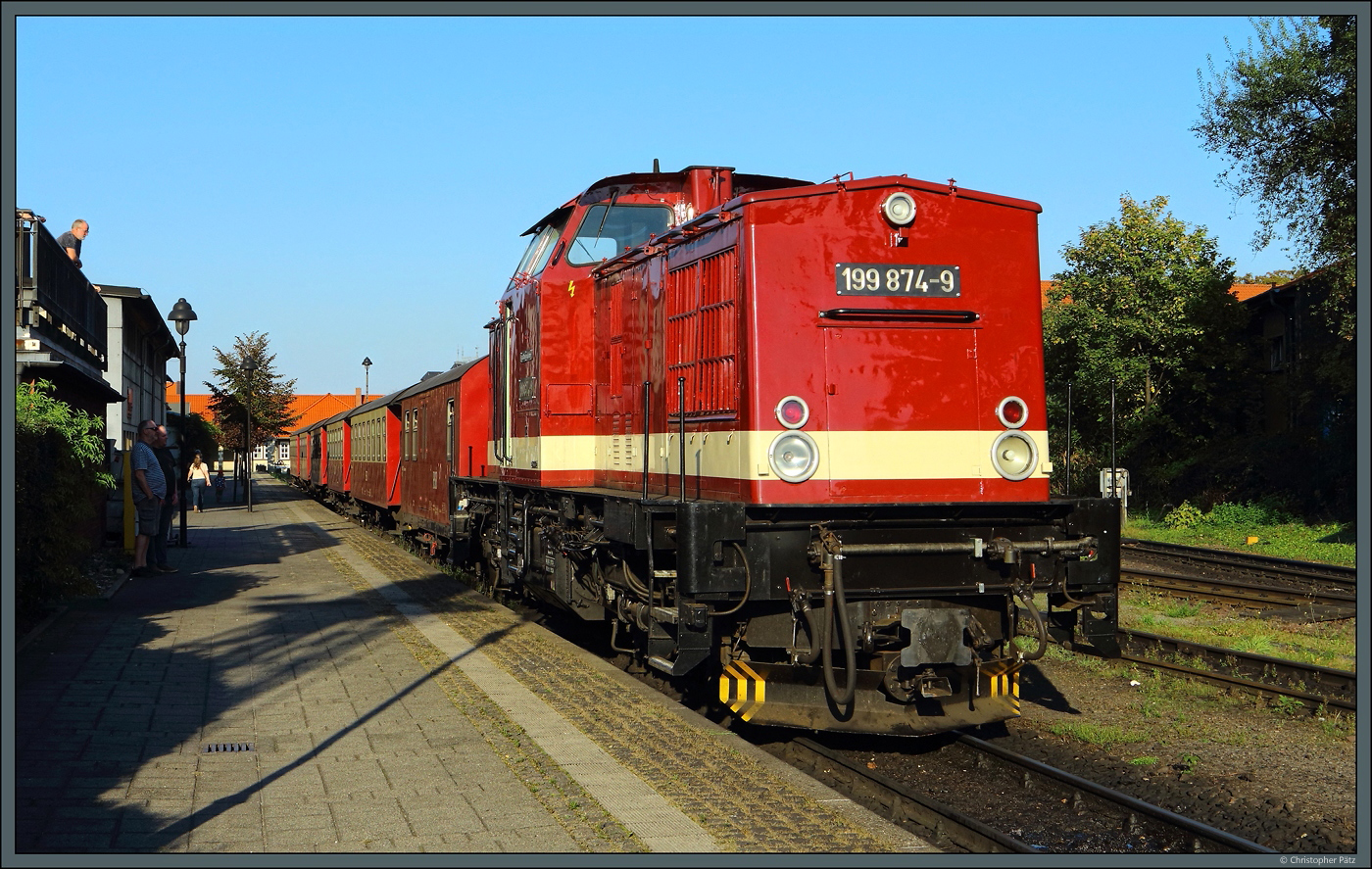 Im Bahnhof Wernigerode steht am 21.09.2024 199 874-9 mit dem Zug nach Eisfelder Talmühle bereit.