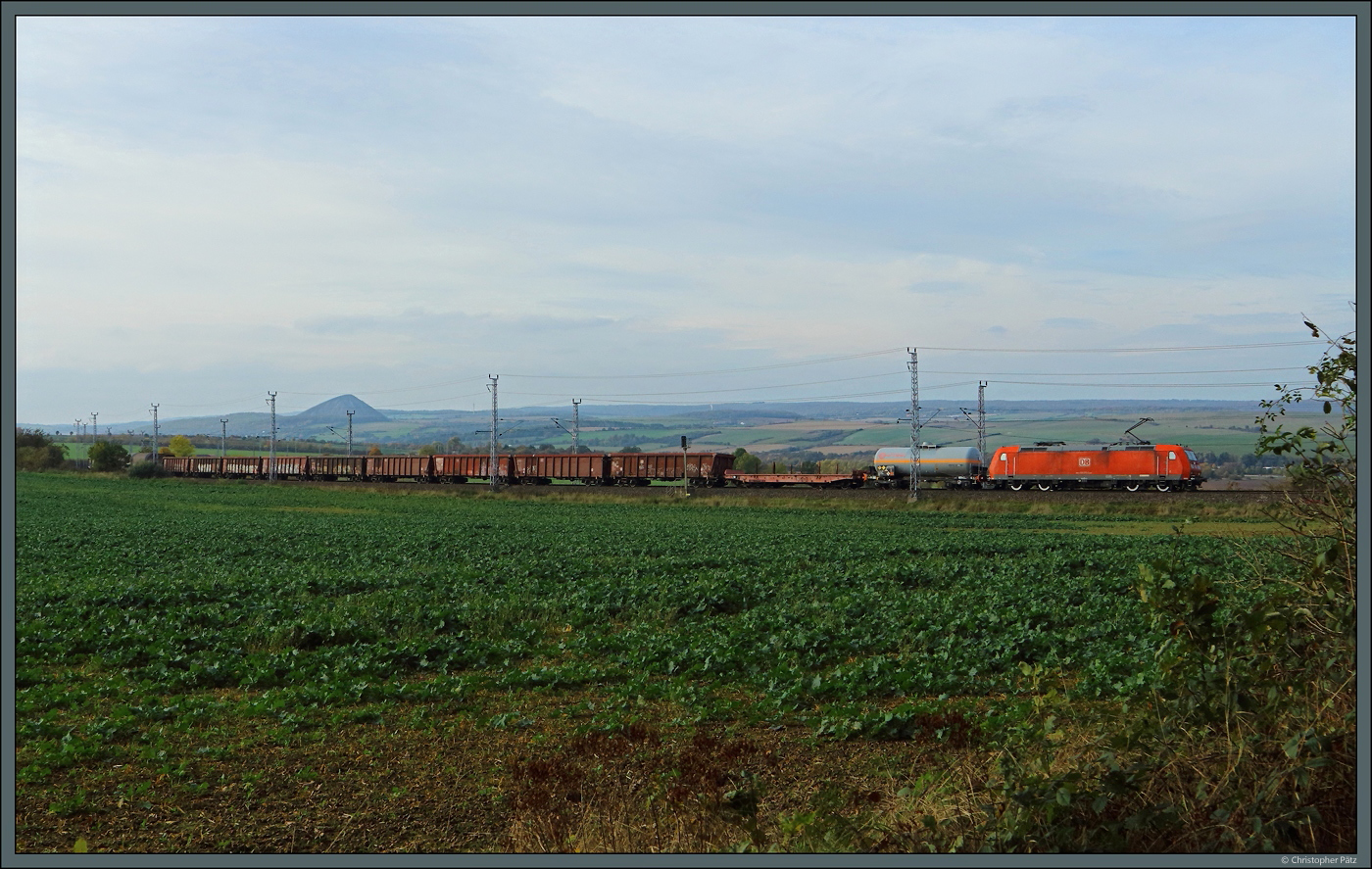 185 075-9 der DB Cargo zieht am 20.10.2024 einen gemischten Güterzug die Blankenheimer Rampe bei Sangerhausen hinauf.