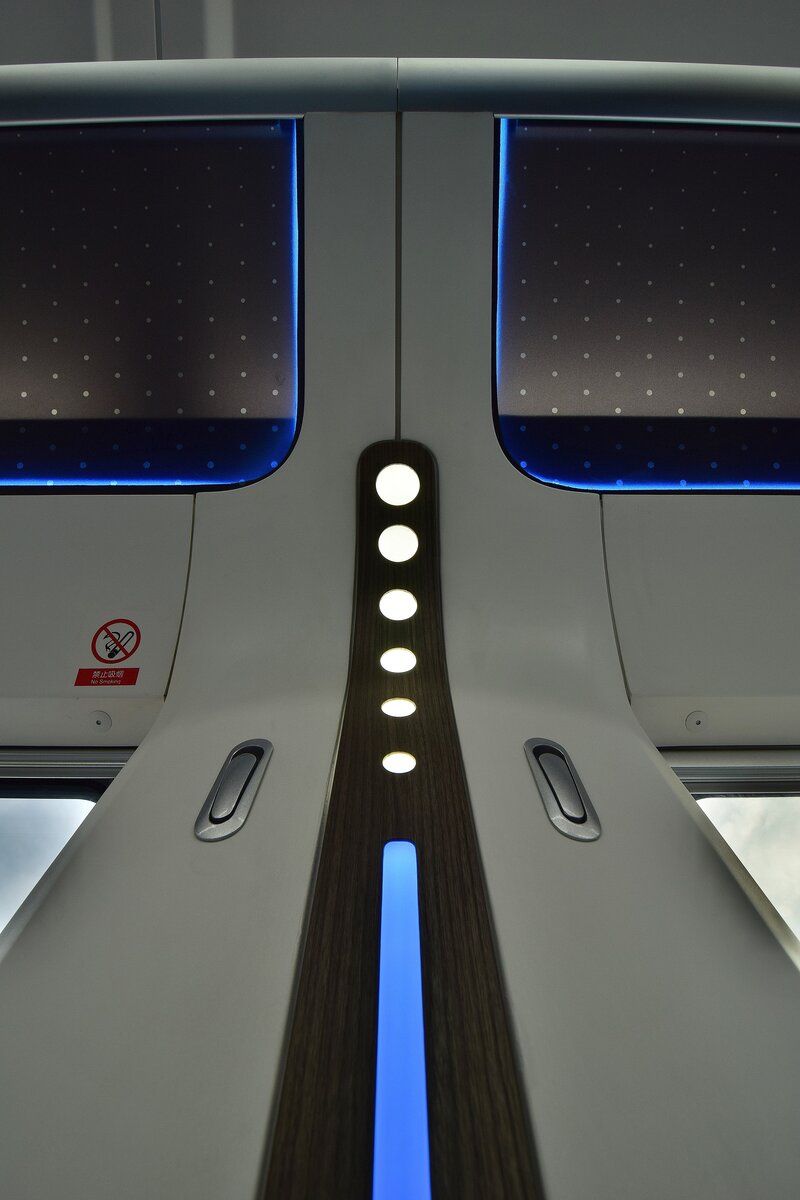 Im Innenraum präsentiert sich der CINOVA H2 sehr hell mit futuristischem Design. Dieser Triebzug wurde von China Railway Rolling Stock Corporation entwickelt und wird mit Wasserstoff betrieben und schafft mit einer Tankladung 1200km. Seine Maximalgeschwindigkeit beträgt 200km/h, im Fahrgastverkehr wird er jedoch nur mit 160km/h eingesetzt.