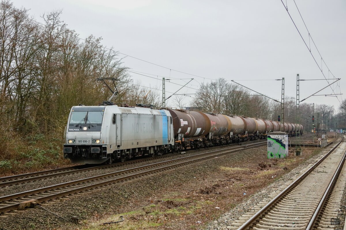 185 696-2 Railpool mit Kesselzug in Gelsenkirchen Buer Nord, Januar 2023.