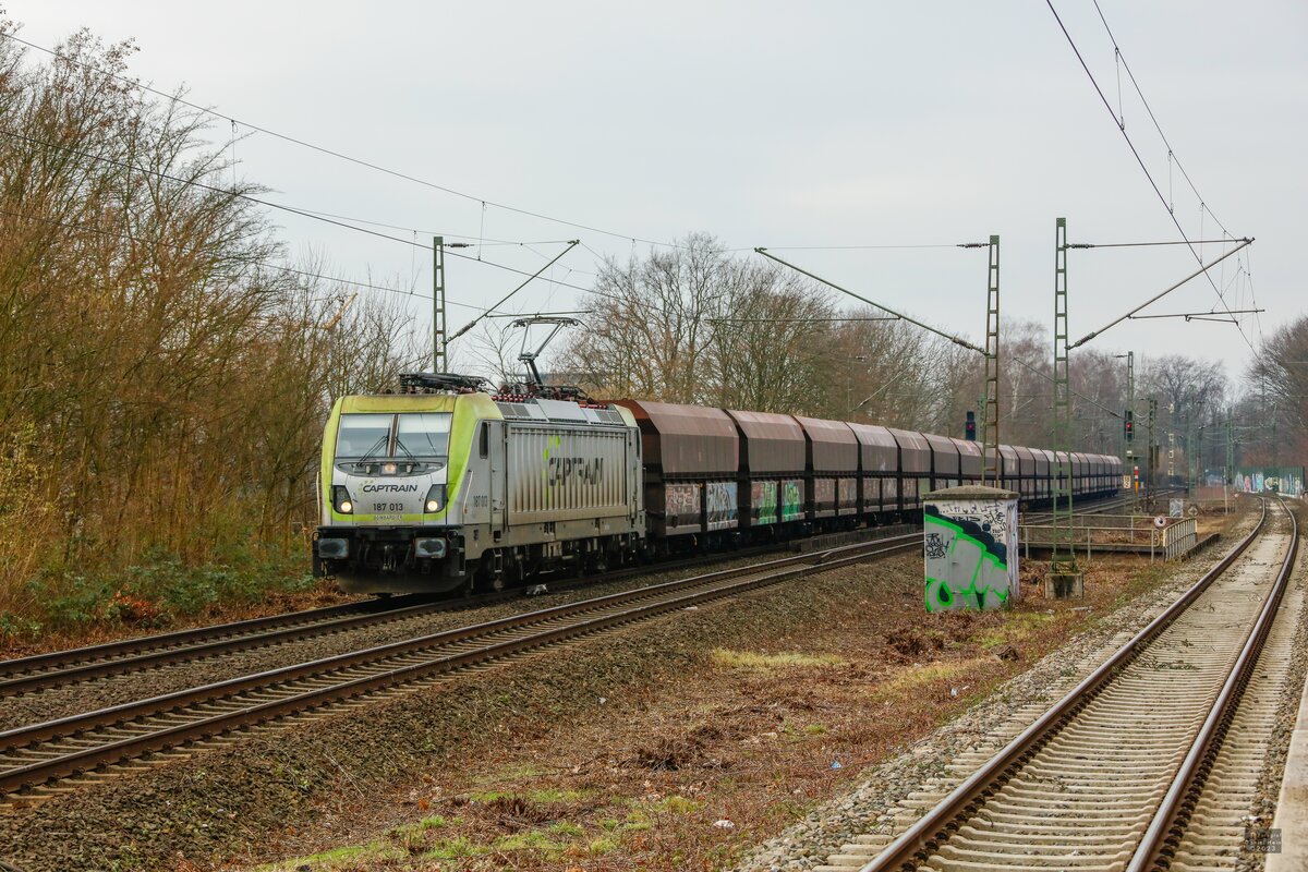 187 013 Captrain mit Kohlezug in Gelsenkirchen Buer Nord, Januar 2023.