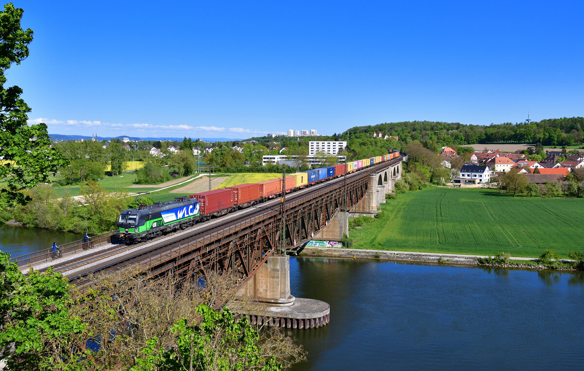 193 284 mit einem Containerzug am 27.04.2024 bei Regensburg-Prüfening.
