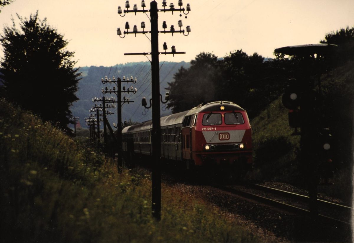 22.Juli 1992 am Evsign. des Bf.Fichtenberg mit E 3779 Stuttgart -Crailsheim mit 215 057-1 kurz vor dem Einfahren in den Schanztunnel(860m) vor Bahnhof Fichtenberg .Murrrbahn wurde 1996 elektrifiziert für 50 Millonen DM. .