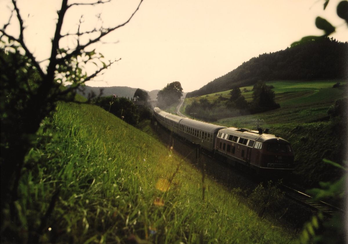 15. Juli 1992 Schnellzug D 2668 Görlitz nach Stuttgart Bespannung ,ab Hbf. Hof mit Baureihe 218 des Bw Regensburg 218 235-0 zwischen Gaildorf/West und Mittelrot. Murrrbahn wurde 1996 elektrifiziert für 50 Millonen DM
