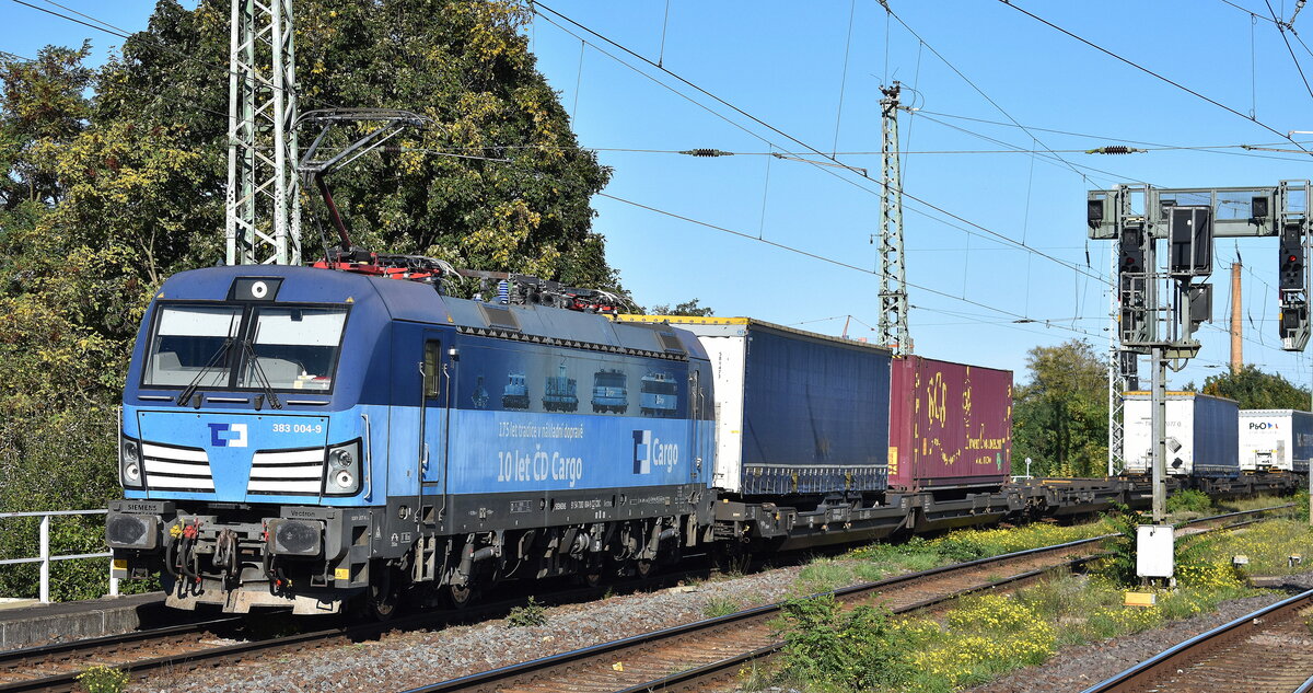 ČD Cargo a.s., Praha [CZ] mit ihrer "383 004-9" [NVR-Nummer: 91 54 7383 004-9 CZ-CDC] und einem KLV-Zug am 15.10.24 Höhe Bahnhof Magdeburg Neustadt.