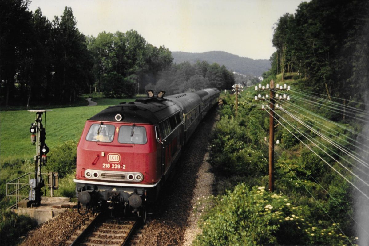 26.Mai 1993 beim Evsign. Bf. Oppenweiler 218 239-2( Bw NRH) mit E 3102 von Crailsheim nach Stuttgart Fotostandplatz auf dem Signalkorb Vorsignal von Sulzbach/Murr. Murrrbahn wurde 1996 elektrifiziert für 50 Millonen DM