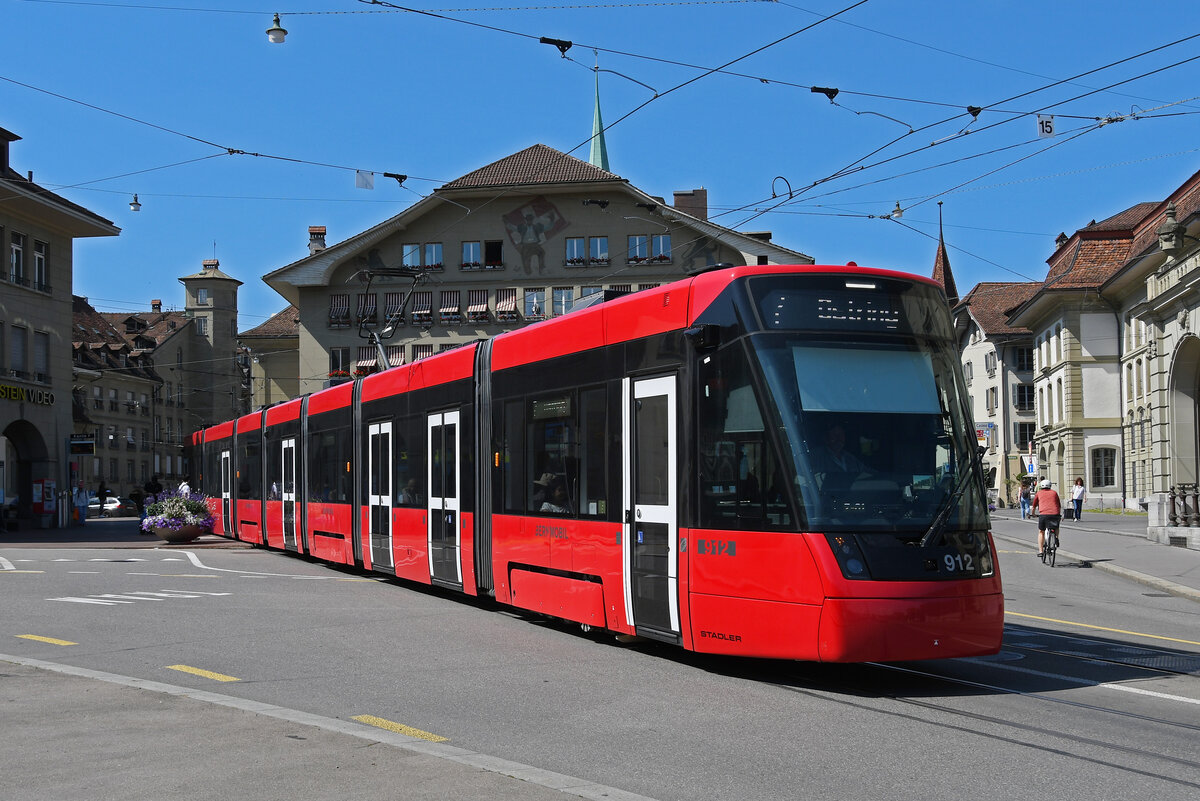Be 6/8 912 Tramlink, auf der Linie 7, verlässt am 09.07.2024 die Haltestelle Zytglogge beim Casinoplatz. Aufnahme Bern.