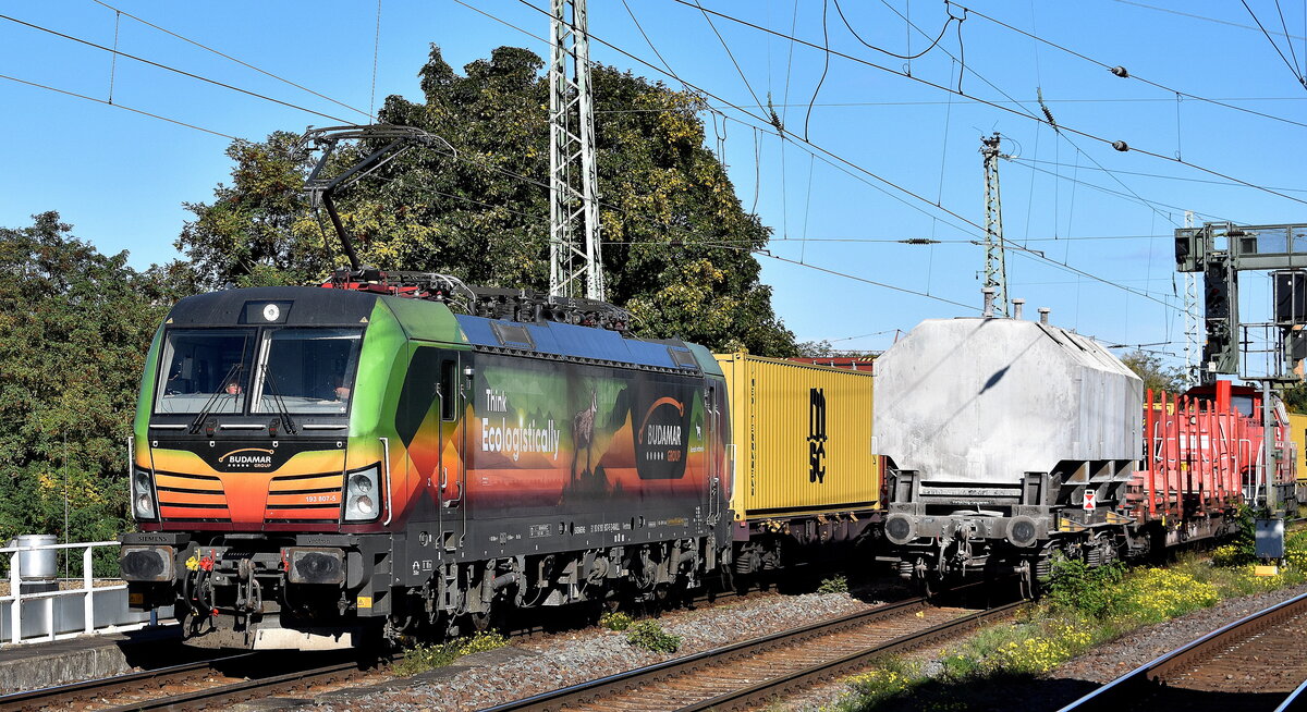 BUDAMAR LOGISTICS, a.s., Bratislava [SK] mit der Vectron "193 807-5" [NVR-Nummer: 91 80 6193 807-5 D-RAILL] und einem Containerzug am 15.10.24 Höhe Bahnhof Magdeburg Neustadt.
