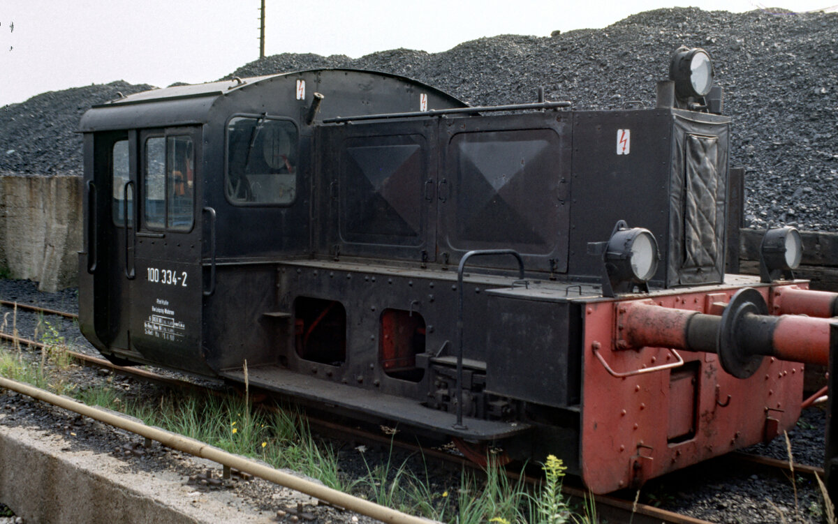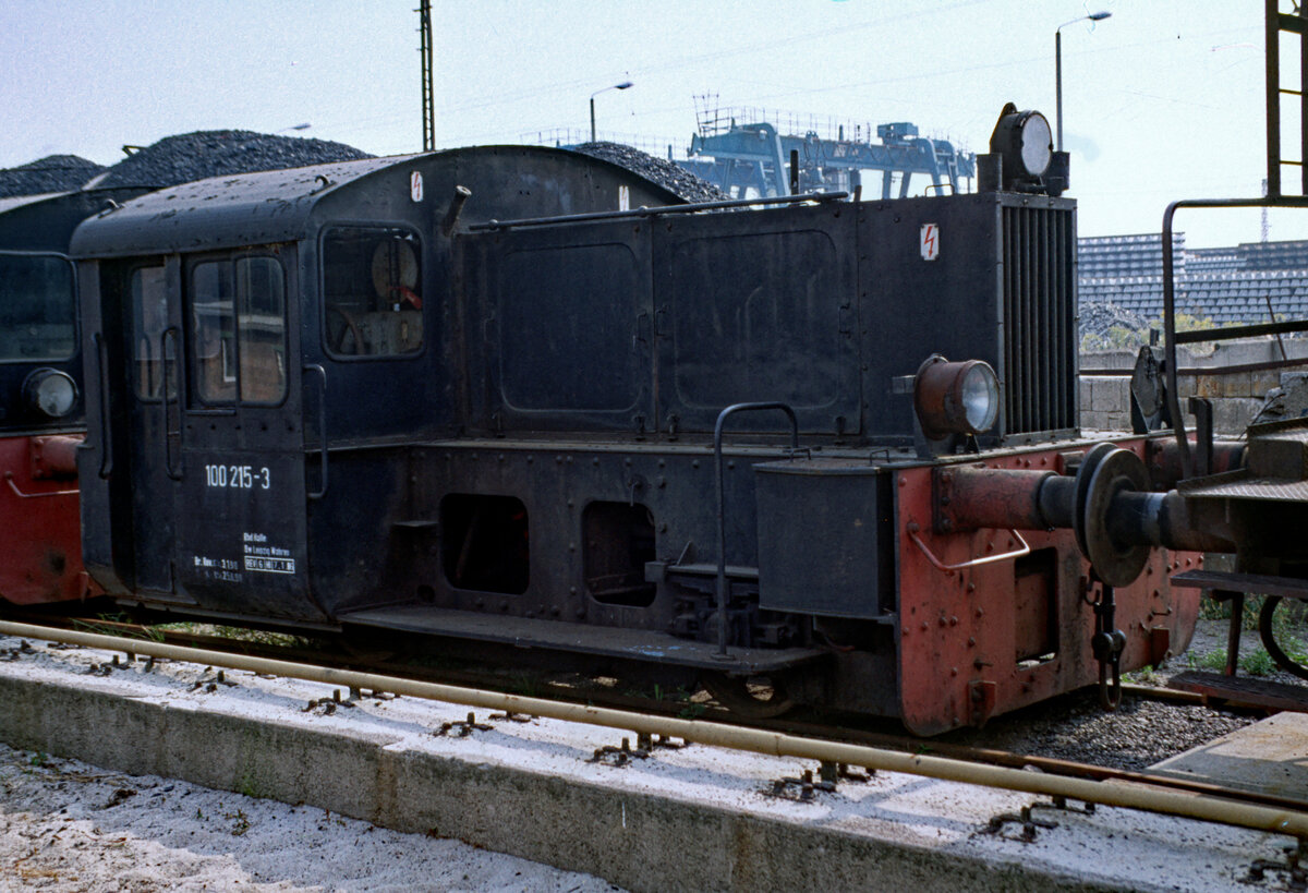 Vor einem Schwellenlager wurde am 19.09.1991 im Bw. Leipzig-Wahren die 100 215 fotografiert.
