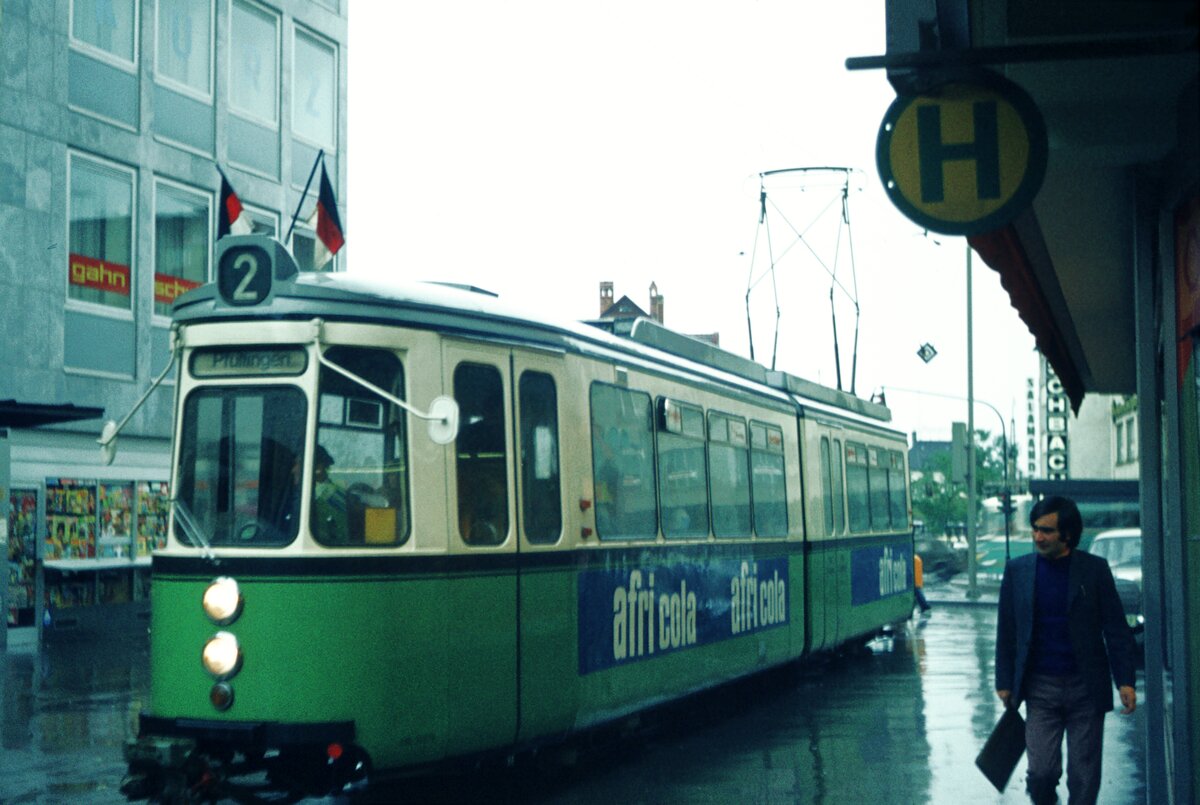 Vor 50 Jahren__Die Straßenbahn in Reutlingen verkehrte das letzte Mal am Samstag, 19. Oktober 1974. Im Bild ZR GT4 [ME 1964; 1976 an SSB, weiter nach Ulm, Umbau zu ER-Wagen +1988] am letzten Betriebstag an der Endstation in der Reutlinger Wilhelmstr. auf Linie 2 nach Pfullingen.__19-10-1974