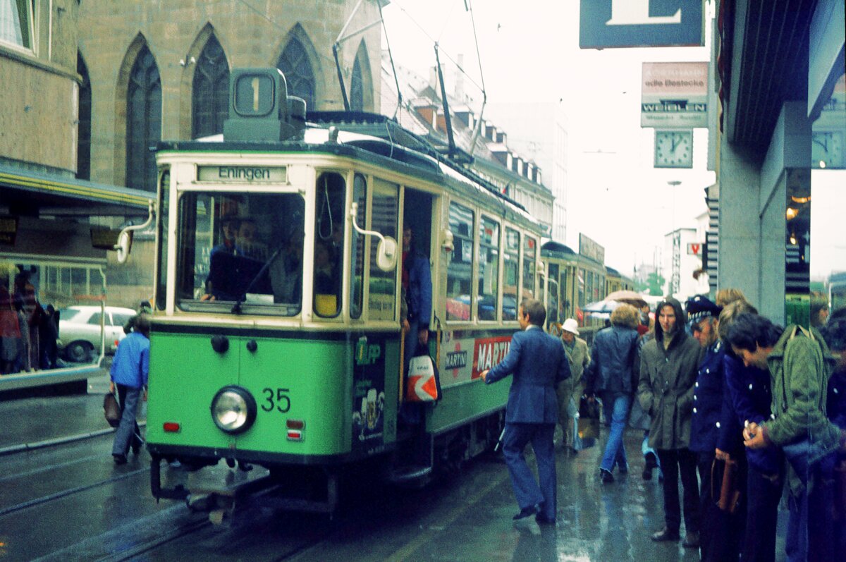 Vor 50 Jahren__Die Straßenbahn in Reutlingen verkehrte das letzte Mal am Samstag, 19. Oktober 1974. Im Bild 3-Wagenzug mit Tw 35 [ME 1929; 1962 ex SSB 259; heute als SSF 15* im Straßenbahnmuseum] am letzten Betriebstag in der Reutlinger Wilhelmstr.(Fähnchen nur auf einer Plattform). Mittags wurden noch die beiden Schülerzüge gefahren.(? Ja damals war auch am Samstag noch Schule.) Das Wetter paßte zur traurigen Stimmung, auch überwiegend in der Bevölkerung.__19-10-1974 *Städt. Straßenbahn Feuerbach.