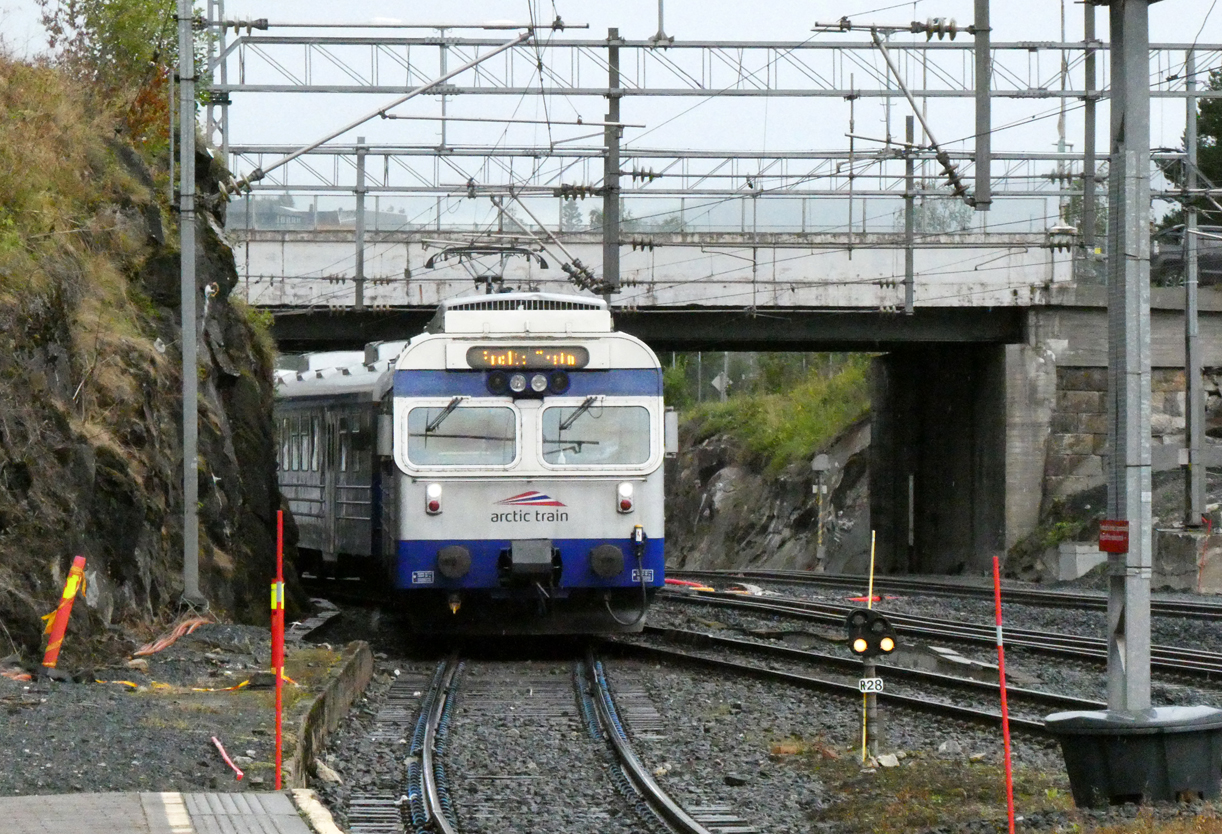 Der Arctic Train fährt bei Regenwetter vom Abstellfeld in den Bahnhof Narvik ein. Narvik, 16.8.2024