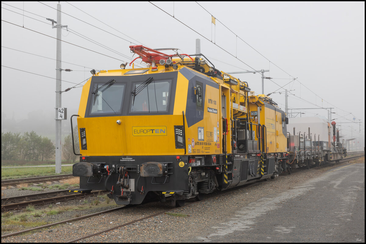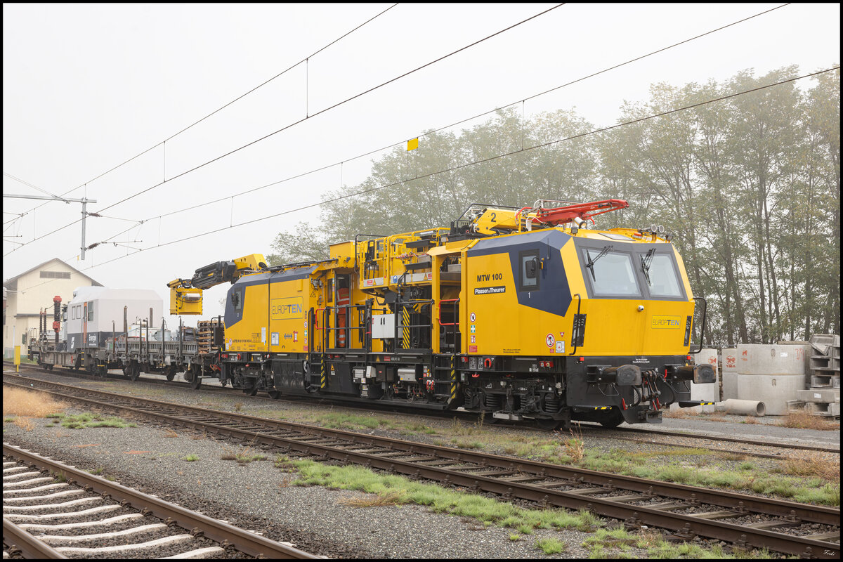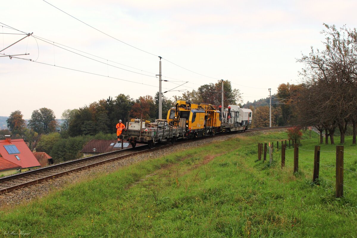 Hier bringt am 20.10.2024 ein Turmtriebwagen der Firma Europten besagten Wagen mit Prüfgerät nach Deutschlandsberg zu sehen auf der Leibenfelder Höhe kurz vor dem Bahnhof Deutschlandsberg.