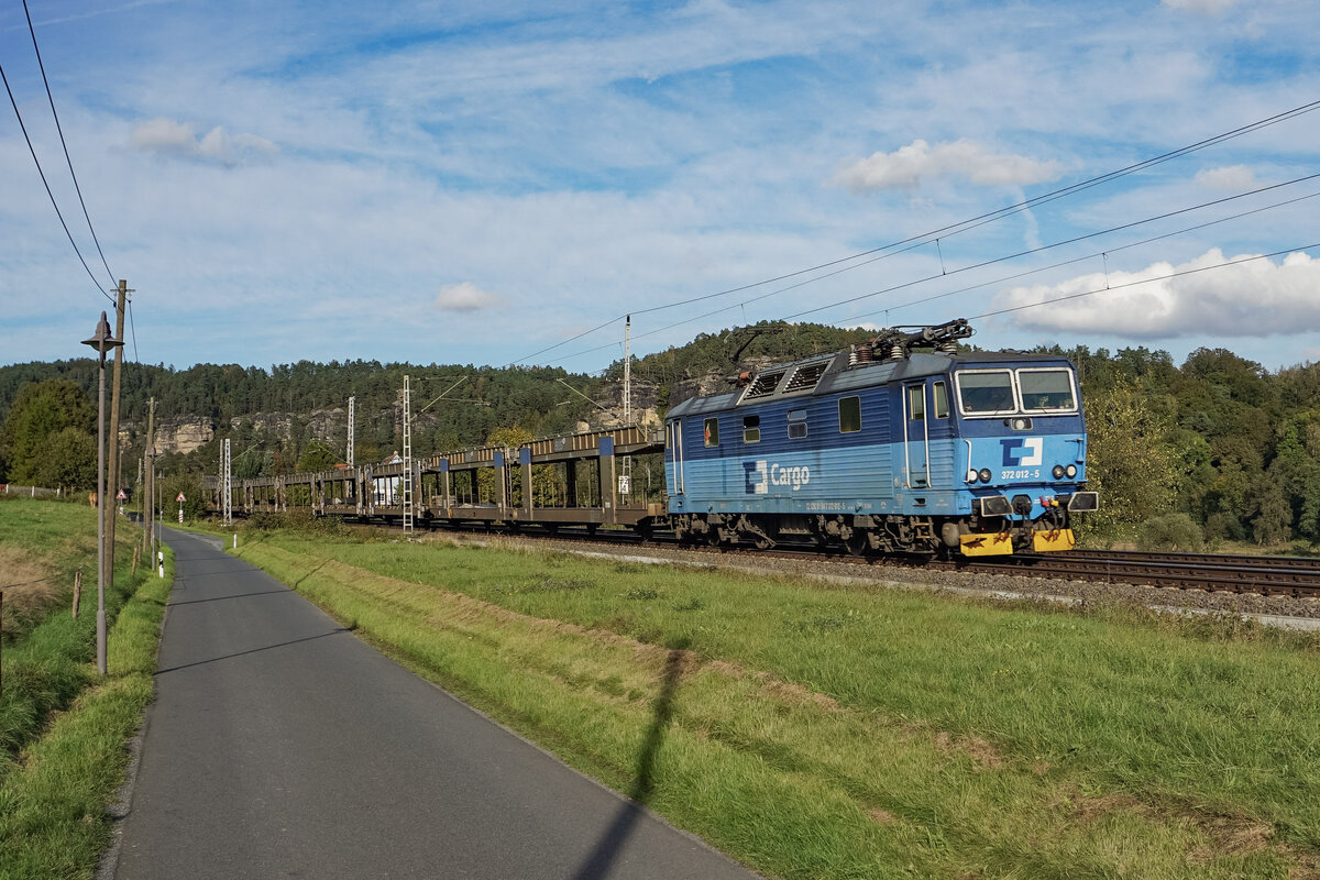 CD Cargo 372 012 legte sich am 09.10.2024 mit einem leeren Autozug aus Falkenberg(Elster) in die berühmte Fotokurve zwischen Strand und Rathen in der sächsischen Schweiz.