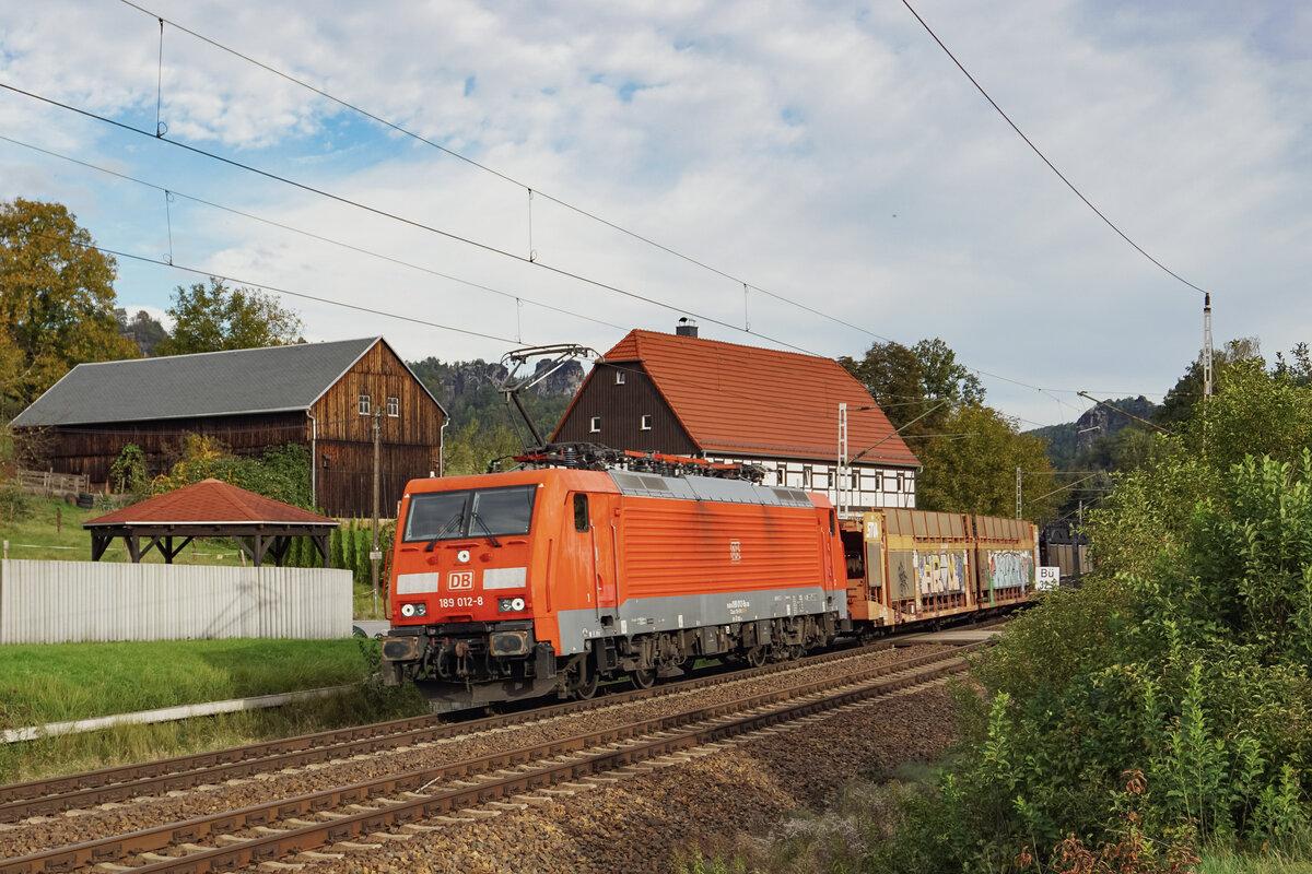DB Cargo 189 012 mit einem leeren Autozug am 10.10.2024 bei Rathen, in Richtung Tschechien fahrend.