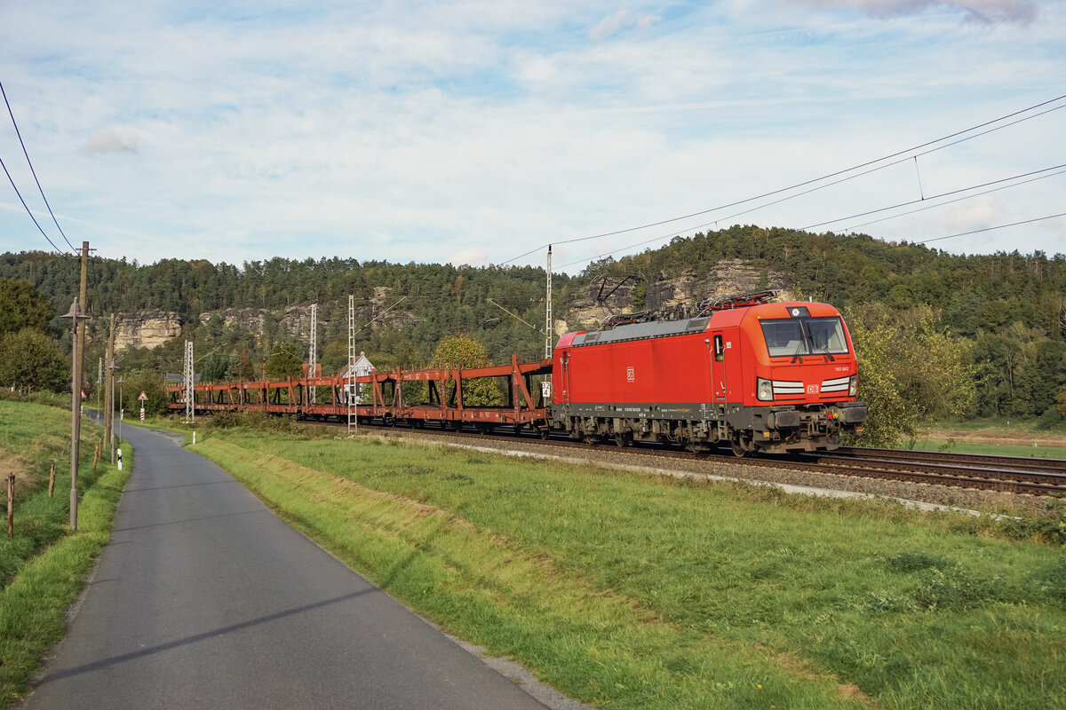 DB Cargo 193 842 legte sich am 09.10.2024 mit einem Autozug in den berühmten Rathener Fotobogen.