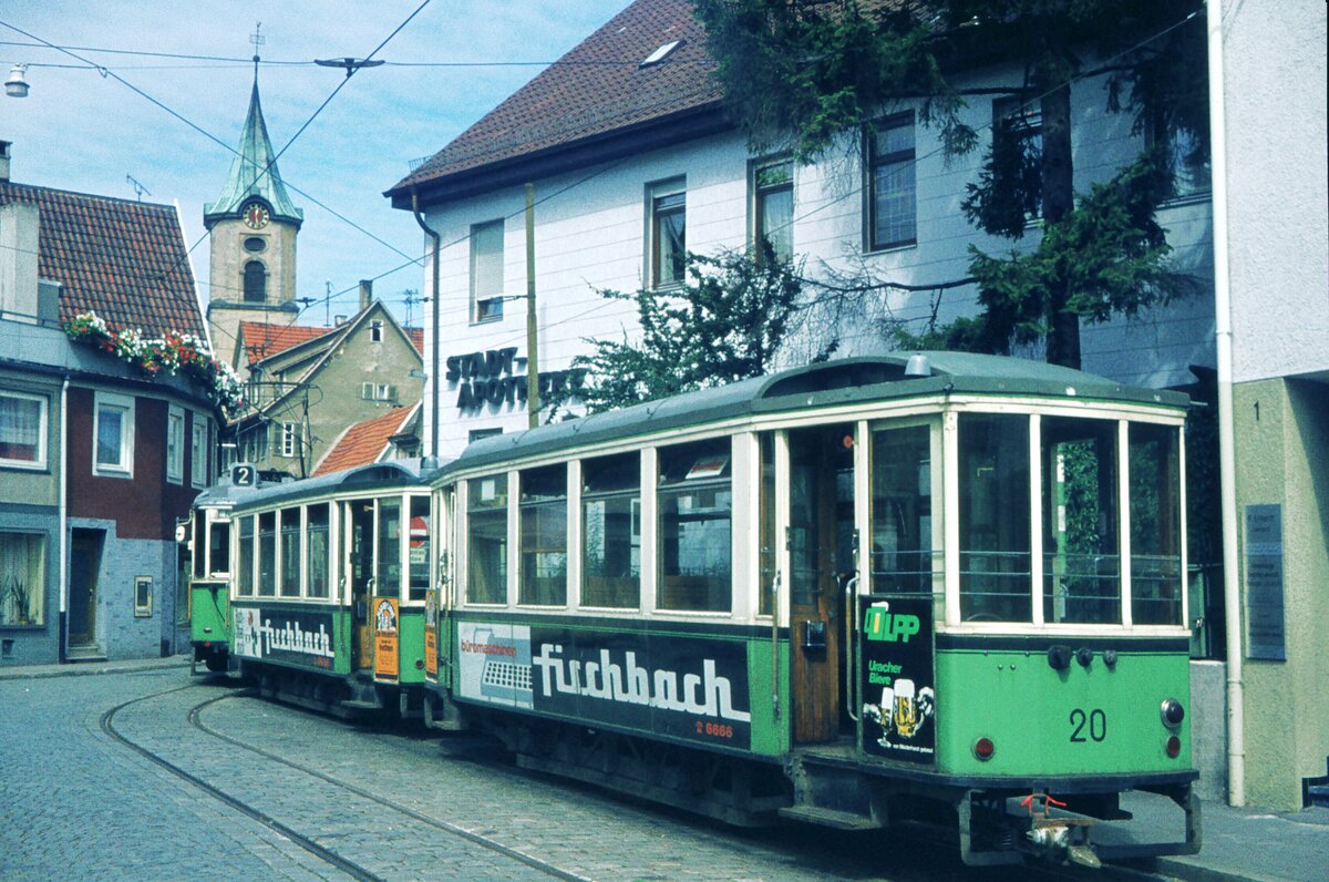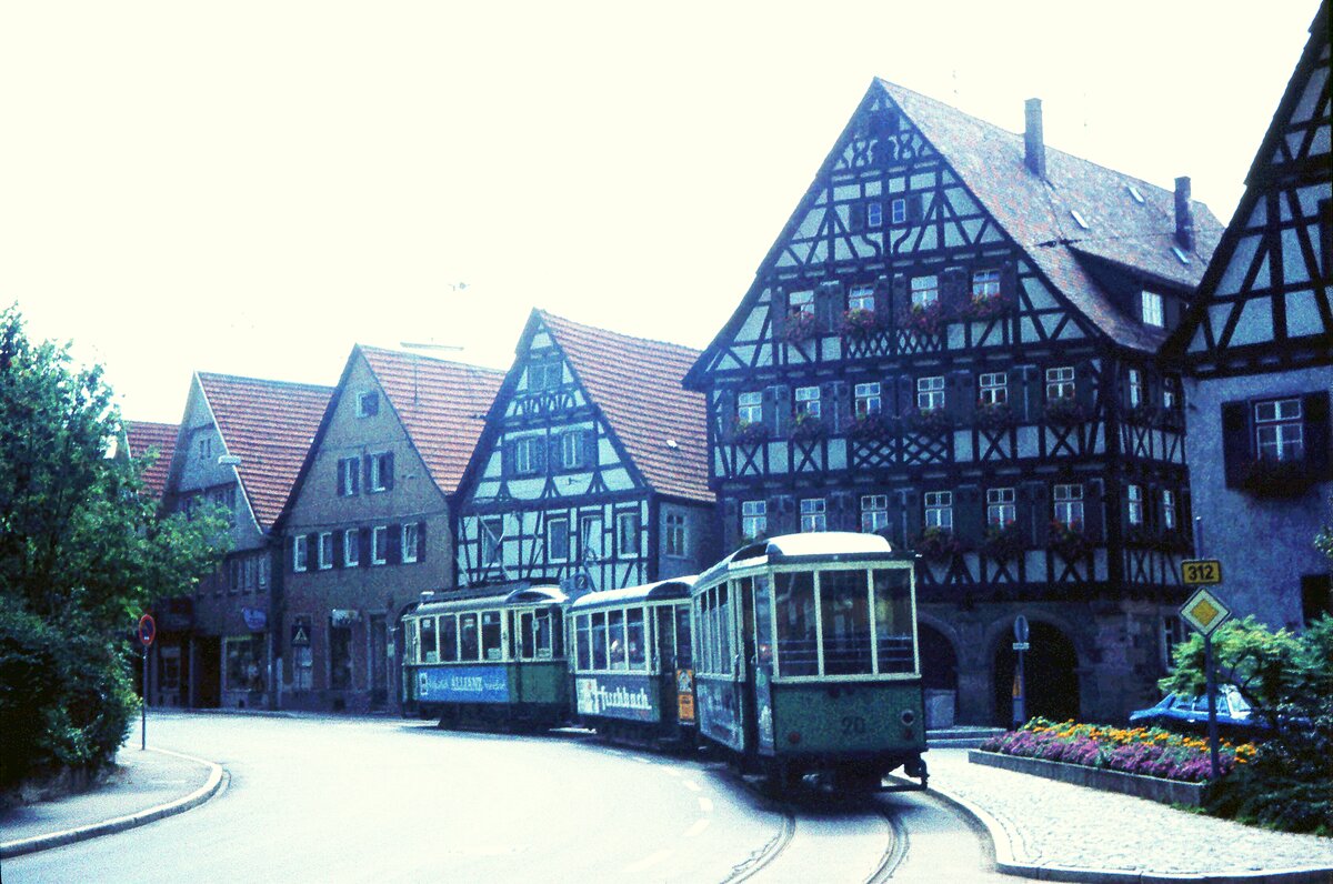 Vor 50 Jahren__Die Straßenbahn in Reutlingen verkehrte das letzte Mal am 19. Oktober 1974. 3-Wagen-Zug auf Linie 2 beim Rathaus in Pfullingen.__02-09-1974