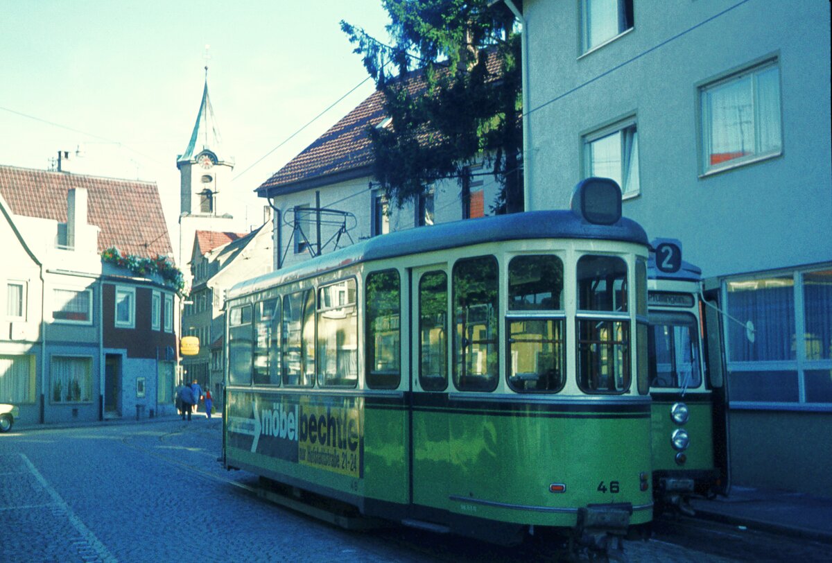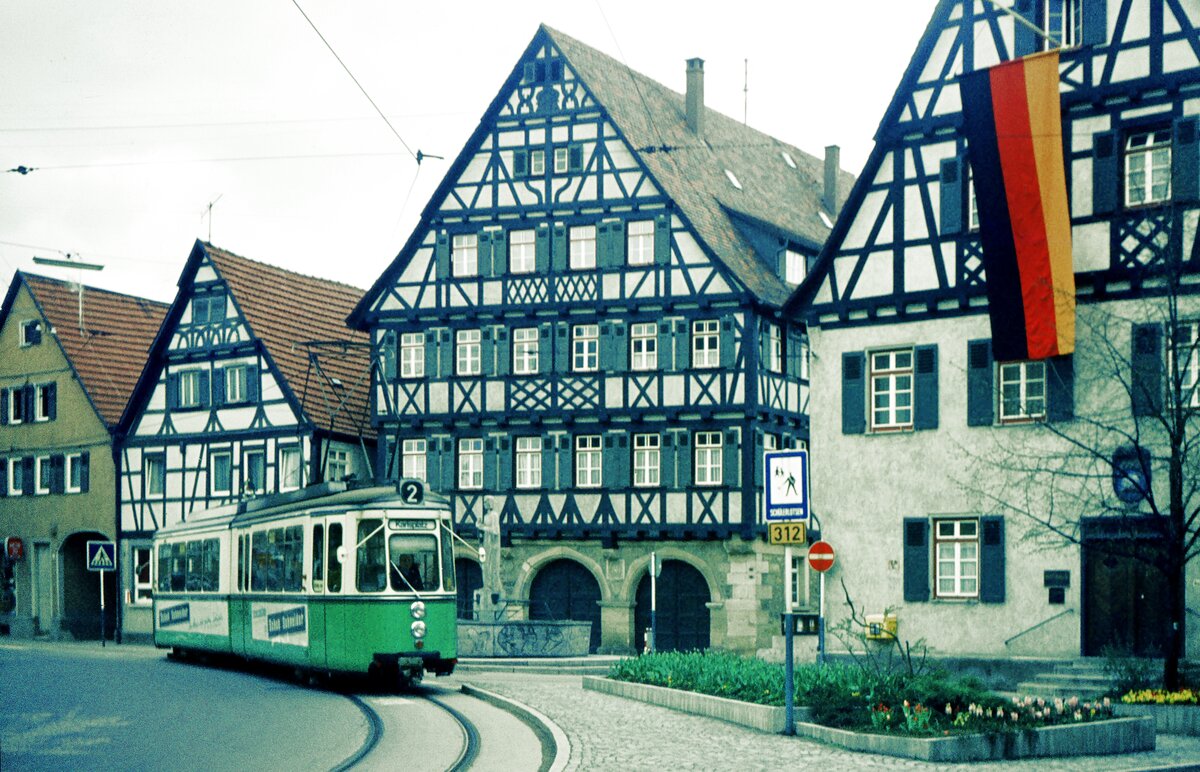 Vor 50 Jahren__Die Straßenbahn in Reutlingen verkehrte das letzte Mal am 19. Oktober 1974. GT4 auf Linie 2 vor dem Rathaus in Pfullingen.__05-09-1974