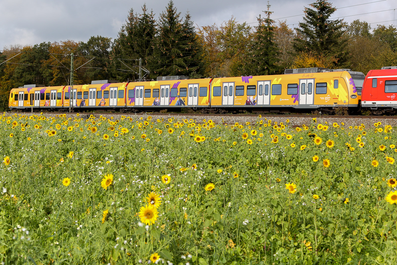 423 119 trägt seit einiger Zeit diese Sonderbemalung, und hier ist jetzt endlich mal ein Bild davon. Die S-Bahn und hübsche Herbstfarben gabs am 19 Oktober 24 bei Eglharting.