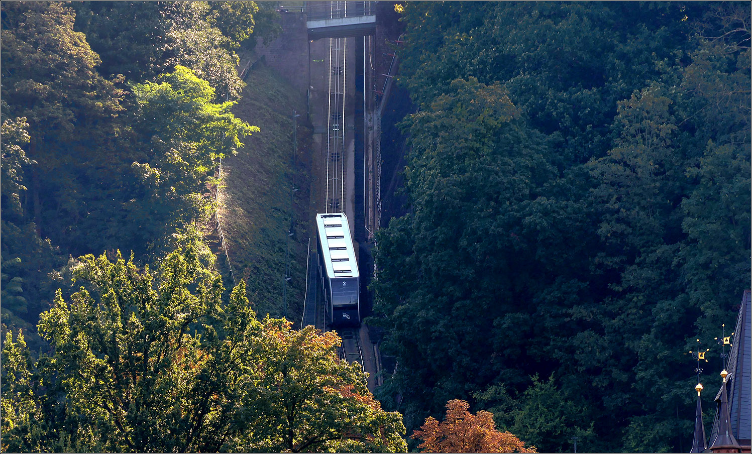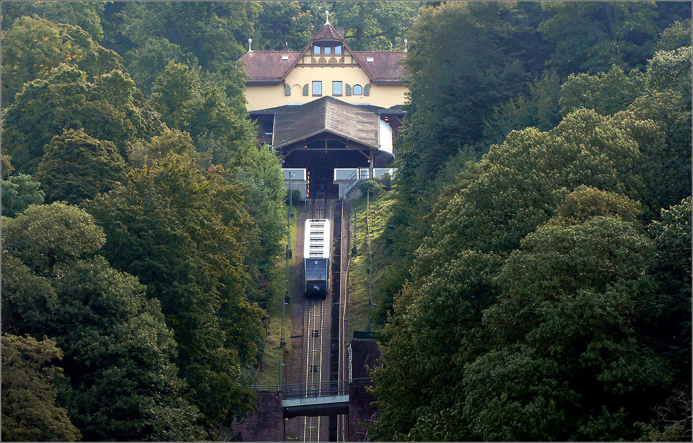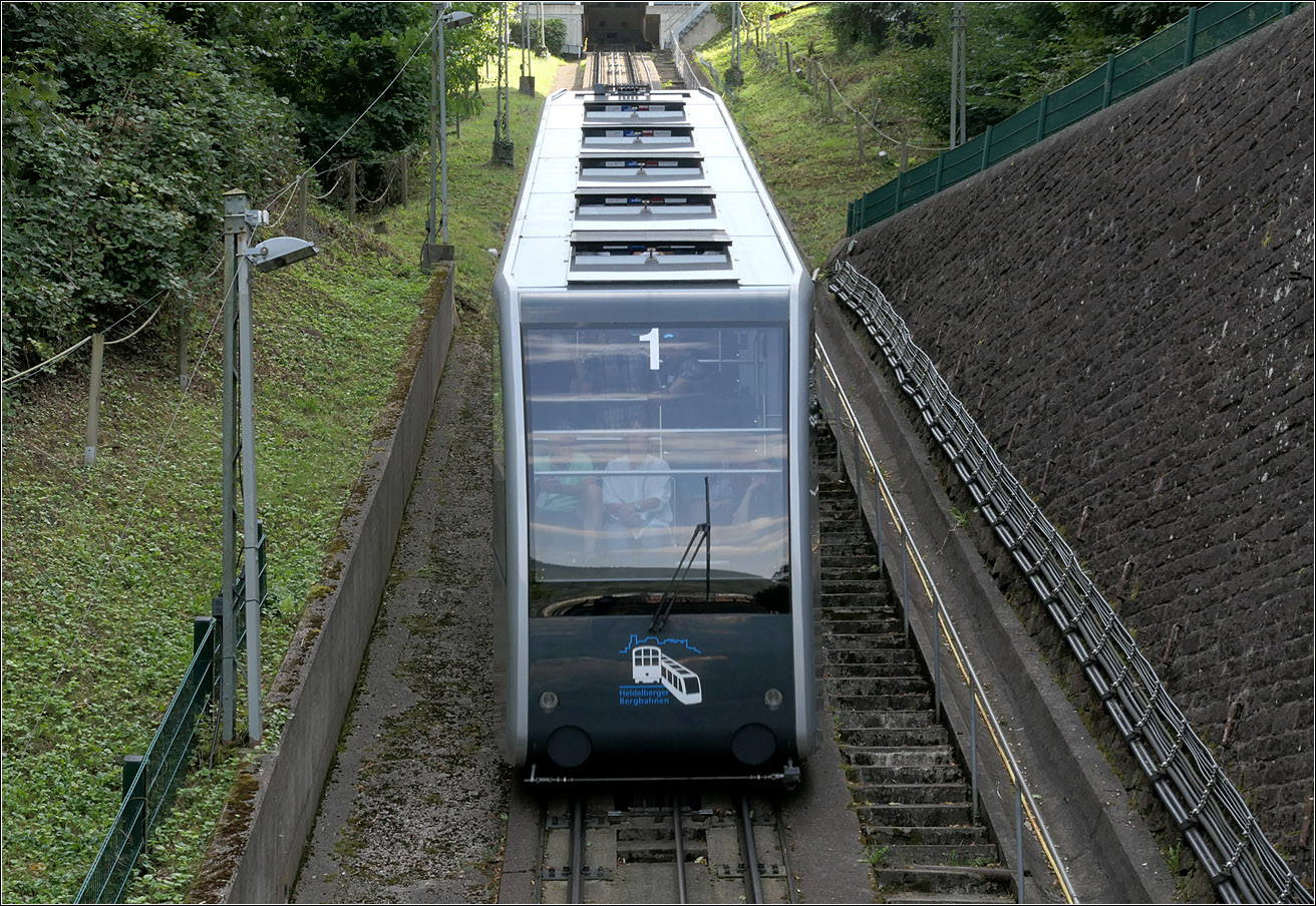 ... erreicht der Heidelberger Seilbahnwagen 3 gleich die untere Endstation Molkenkur. Die Steigung ist aus dieser Perspektive kaum wahrnehmbar.