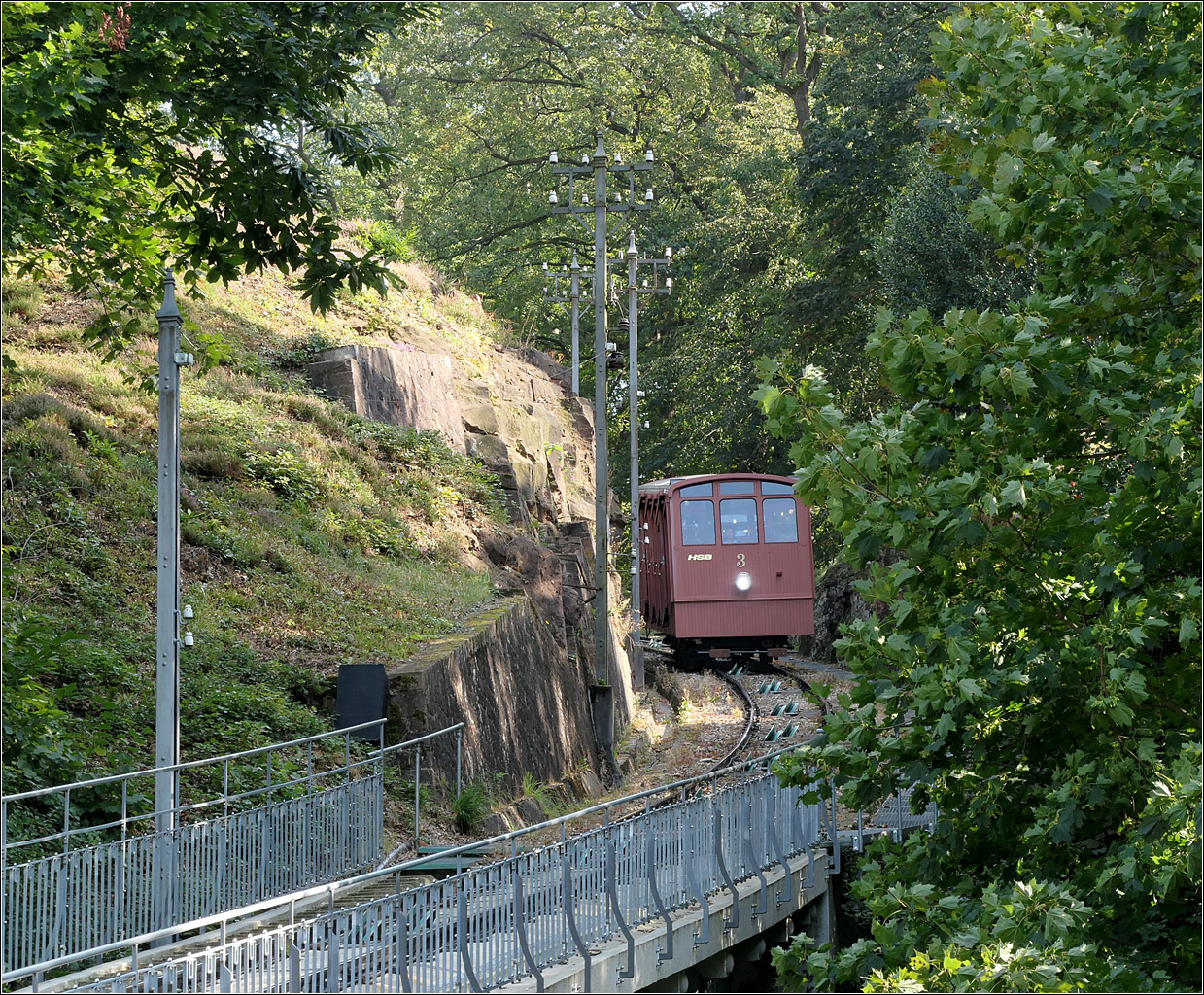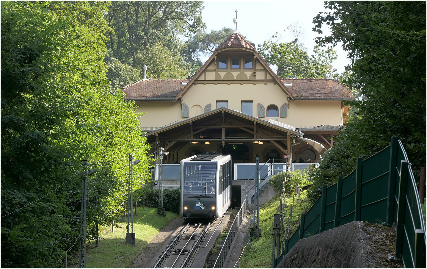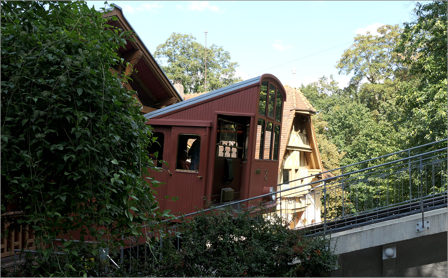 ... erreicht der Heidelberger Seilbahnwagen 3 gleich die untere Endstation Molkenkur. Die Steigung ist aus dieser Perspektive kaum wahrnehmbar.