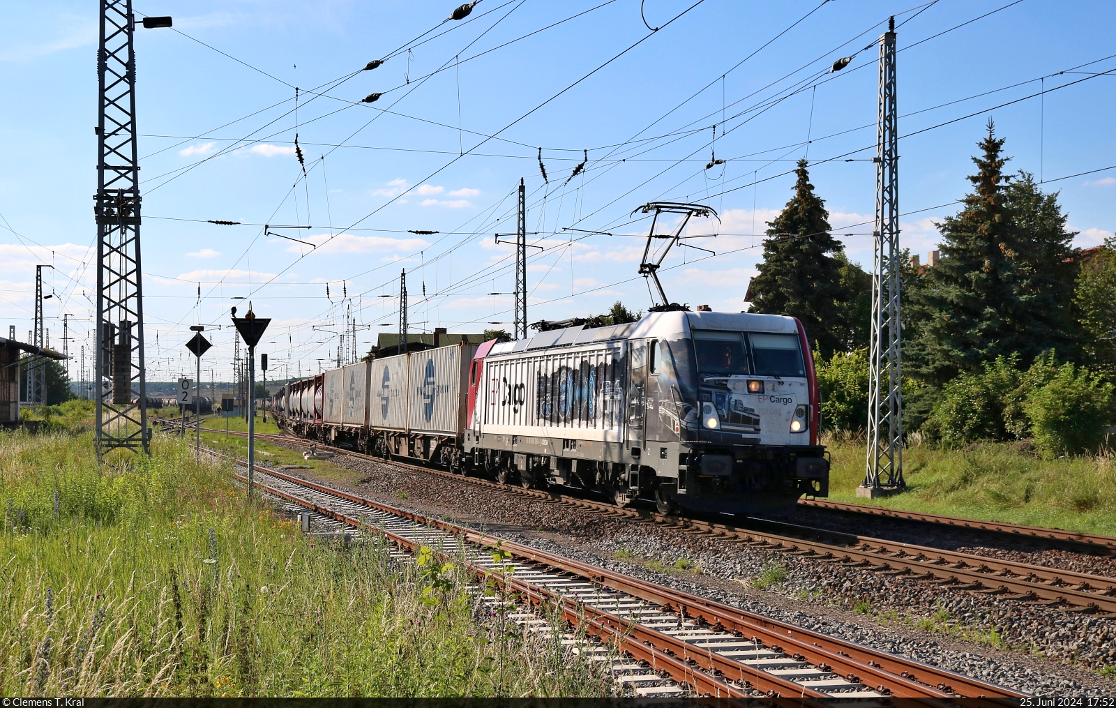 Dem Umleiterverkehr entsprechend lässt sich auch wieder ein Black-BoxX-Containerzug auf der Halle-Kasseler-Bahn blicken. Bespannt war er an diesem lauen Frühsommerabend mit 186 264-8 und durchfährt gerade den Bahnhof Röblingen am See Richtung Sangerhausen.
