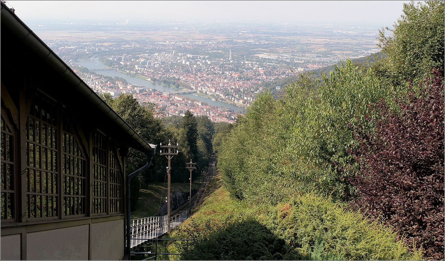 ... hinunter nach Heidelberg und in die Rheintalebene an der oberen Endstation Königstuhl der Heidelberger Bergbahn. Der Höhenunterschied zur Station Kornmarkt beträgt ca. 437 m. Von der Umsteigestation Molkenkur sind es noch 260 m. Die obere Bergbahn hat eine Länge von etwa einem Kilometer, während die untere 471 m lang ist. An der oberen Bergbahn gibt es im Gegensatz zur unteren an der Ausweichstelle keinen Halt.
