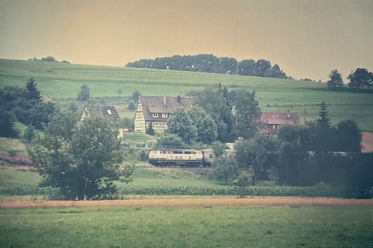 15.07.1992 kurz vor dem (Kappelsbergtunnel) und Bf. Gaildorfwest E 3105 mit drei Bn und einen Bm sowie am Schluß ein Habbiins Wagen gezogen von 218 382-0 nach Crailsheim .Murrrbahn wurde 1996 elektrifiziert für 50 Millonen DM.
