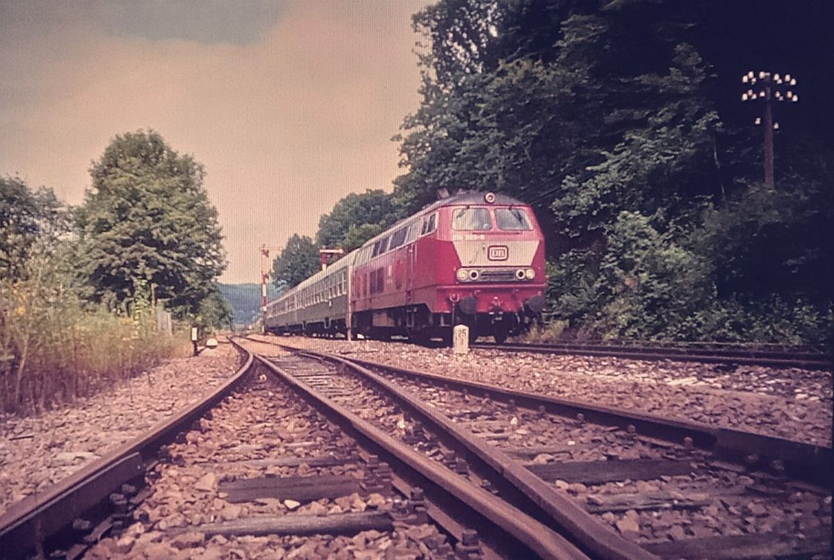 15.07.1992 an den Asignalen des Bf. Oppenweiler 218 383-8 ( Bw NRH) mit E 3100 von Crailsheim nach Stuttgart .Murrrbahn wurde 1996 elektrifiziert für 50 Millonen DM.