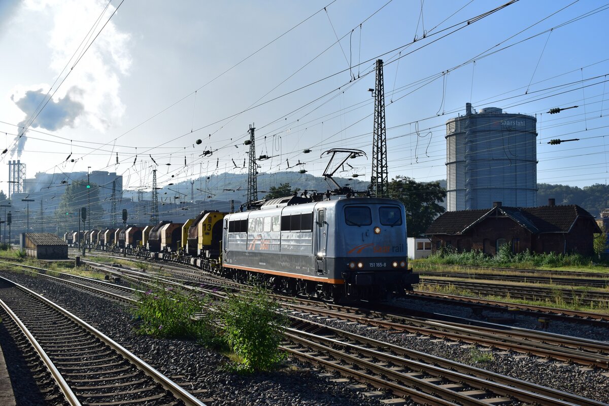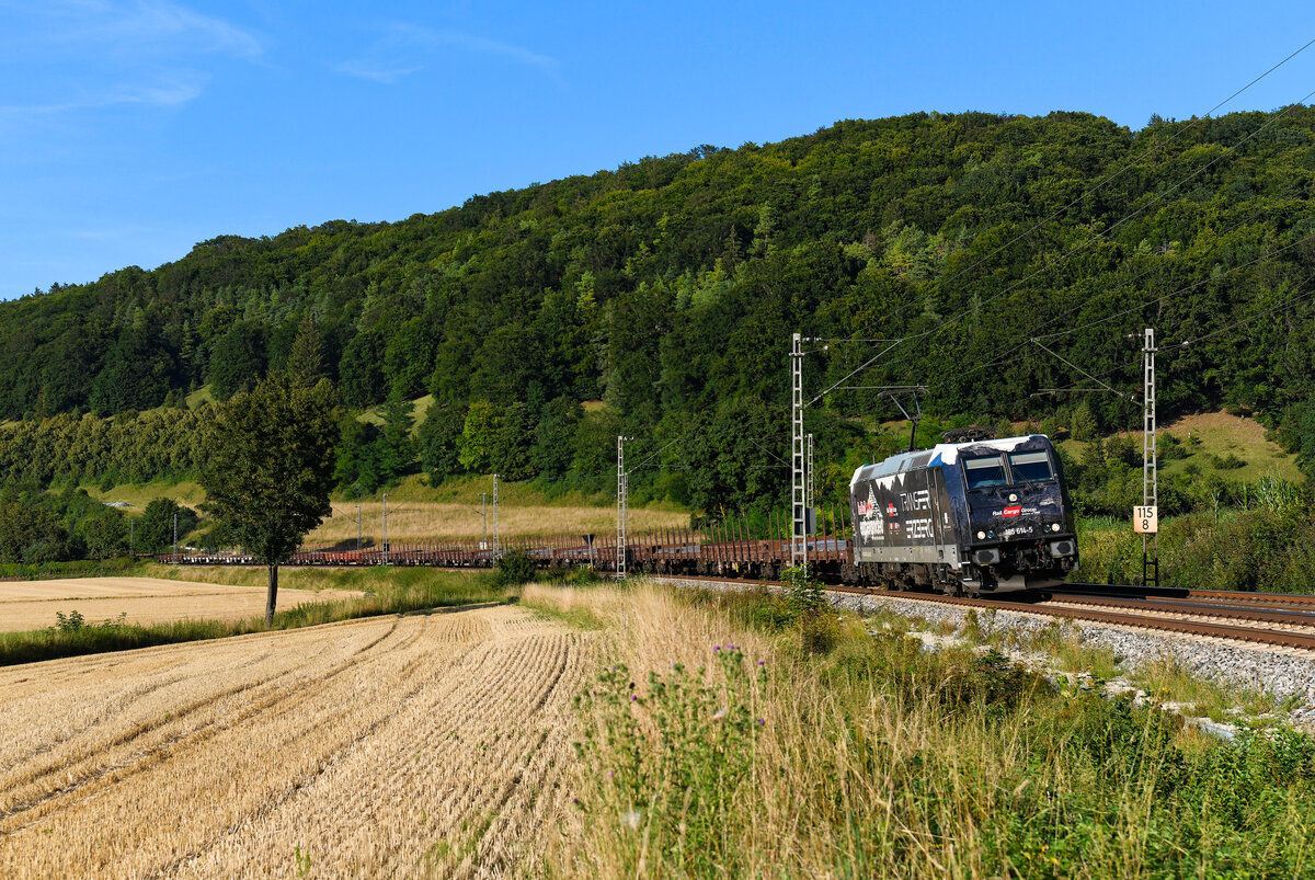 Am Nachmittag des 06. August 2024 wurde aus Freilassing ein Stahlzug gemeldet, der mit der für die ÖBB-Tochter Rail Cargo Logistics fahrenden 185 614 bespannt sein sollte. Diese Lok wirbt für das "Erzbergrodeo", welches vom Energie-Drink Produzenten Red Bull gesponsert wird. Hierbei handelt es sich um ein seit 1995 jährlich im Mai oder Juni stattfindendes Enduro-Motorradrennen am Erzberg bei Eisenerz (Steiermark) in Österreich. Es blieb spannend, welchen Laufweg dieser Zug dann einschlagen würde. Die Fahrzeiten konnte man sich ungefähr ausrechnen, sollte es über Ingolstadt und das Altmühltal nordwärts gehen. Und tatsächlich kam die Lok samt Anhang zur geschätzten Zeit bei Breitenfurt um die Ecke gefahren. Leider war der mit Stahlplatten beladene Wagenpark wenig fotogen, aber - wie es eine Hobbykollege treffend formulierte - "wenigstens waren die Rungen oben...".