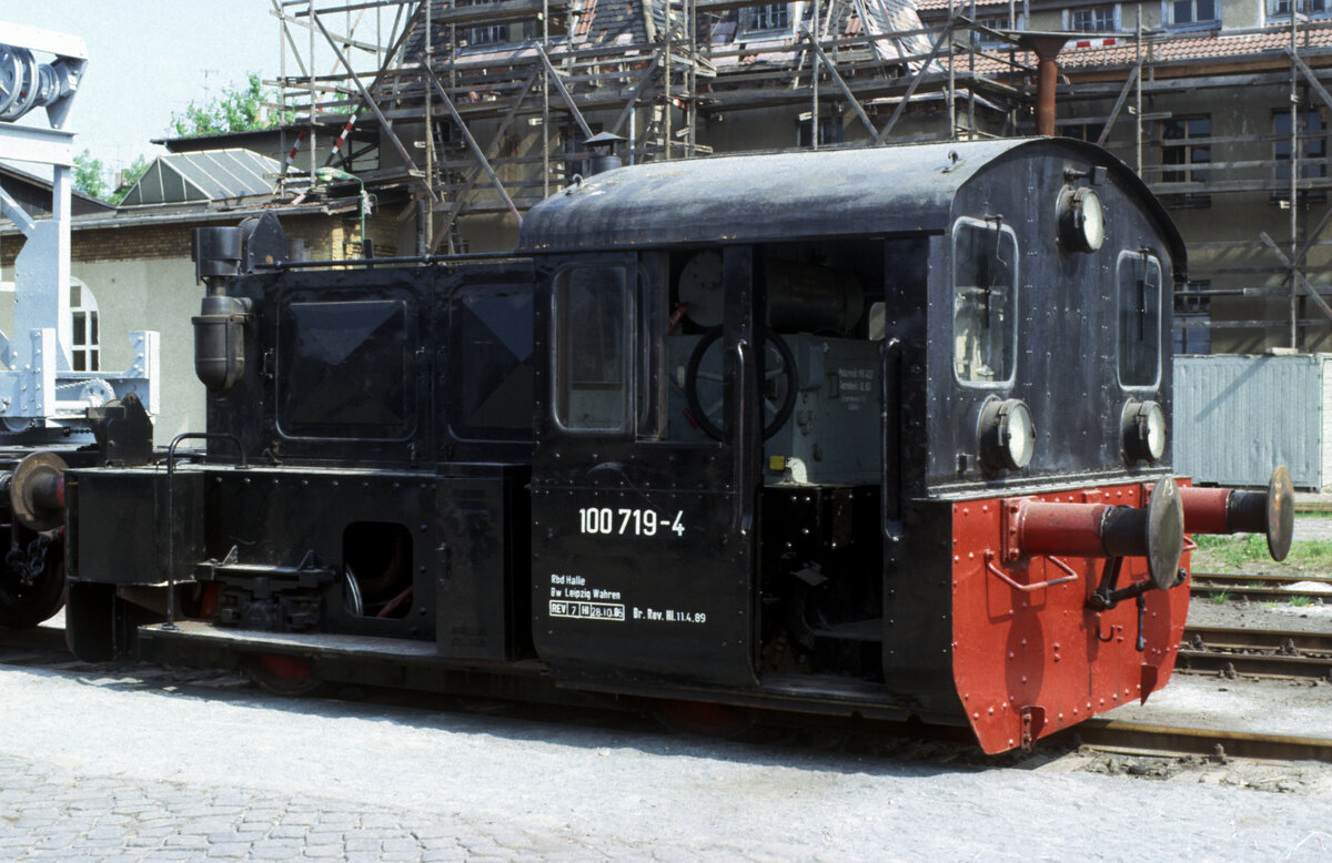 Auf der großen Fahrzeugausstellung "Erste deutsche Fernbahn" am "Dresdener Güterbahnhof" neben dem Leipziger Hbf. ist am 21.05.1989 auch die Kleinlok 100 719 zu sehen.