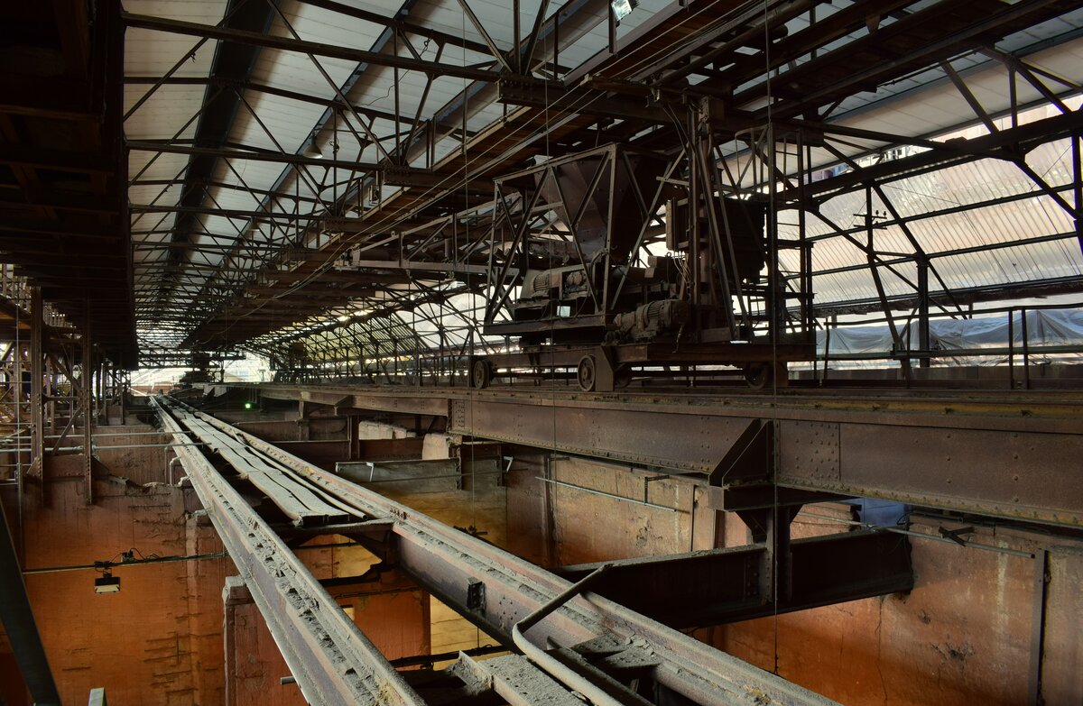 Blick über ein Entladegleis sowie einen Kranwagen in der Möllerhalle der Völklinger Hütte. Hier wurden die benötigten Rohmaterialien für die Eisenproduktion entladen und gelagert. Die Völklinger Hütte ist das weltweit einzige, vollständig erhaltene Eisenwerk aus Hochzeit der Industrialisierung. 1873 wurde die Hütte gegründet und 1986 wurde das Stahlwerk geschlossen. Seit 1994 zählt die Völklinger Hütte als UNESCO Weltkulturerbe. Man entschied sich damals die Hütte umzufunktionieren da ein Abriss der umfangreichen Anlagen viel zu teuer war.