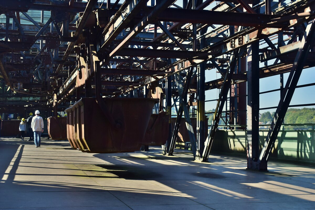 Blick über die Gichtbühne in der Völklinger Hütte in 27m Höhe. Hier verlief ein verzweigtes Netz für Hängebahnwagen welche 6 Hochöfen mit Material versorgten. Es gab in diesem System auch Weichen und sogar Gleisbildstellwerke worüber die Fahrwege der Wagen gesteuert wurden. Die Völklinger Hütte ist das weltweit einzige, vollständig erhaltene Eisenwerk aus Hochzeit der Industrialisierung. 1873 wurde die Hütte gegründet und 1986 wurde das Stahlwerk geschlossen. Seit 1994 zählt die Völklinger Hütte als UNESCO Weltkulturerbe. Man entschied sich damals die Hütte umzufunktionieren da ein Abriss der umfangreichen Anlagen viel zu teuer war.