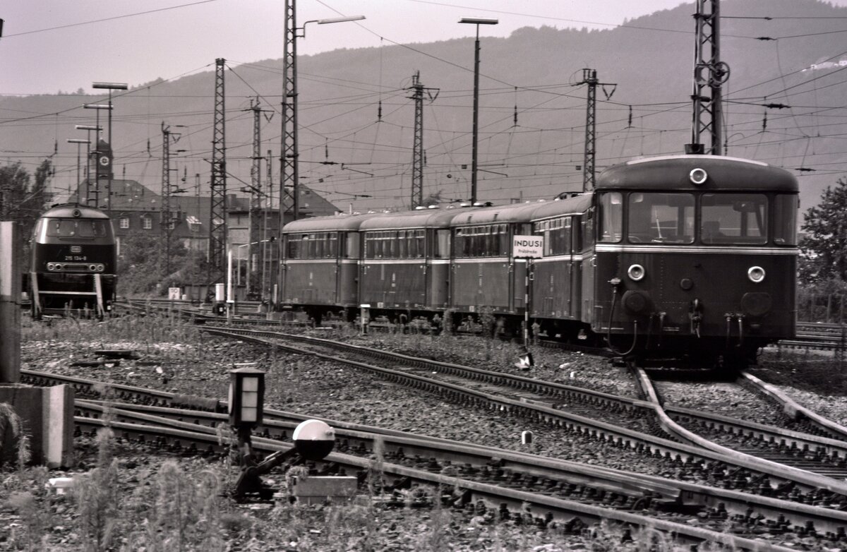 Eine kleine Szene vor dem Bw Trier vom 24.08.1985 mit DB-Lok 215 134-8 und einer Reihe von Uerdinger Schienenbussen: 798 599-7 , 998 090-5 , 998 675-3 , 798 534-4 , 998 318-0 und 998 628-2