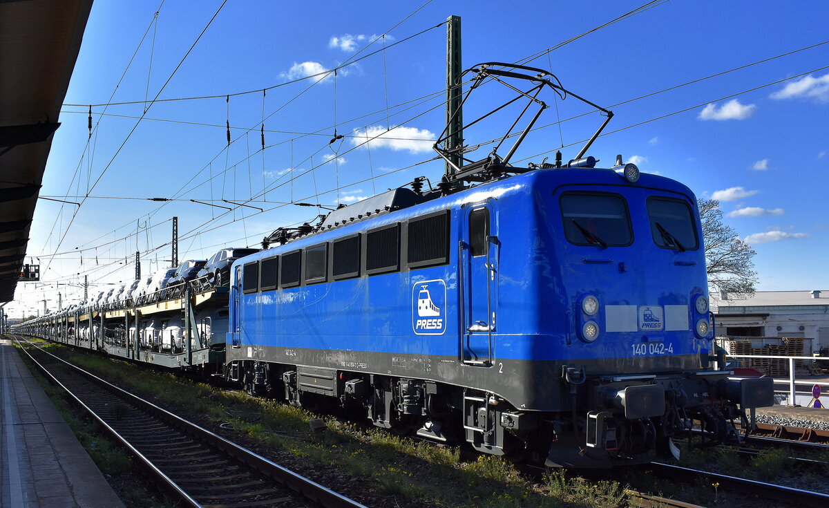 Eisenbahnbau- und Betriebsgesellschaft Pressnitztalbahn mbH, Jöhstadt (PRESS) mit ihrer "140 042-4" (NVR: "91 80 6140 834-3 D-PRESS") und einem PKW-Transportzug am 15.10.24 Höhe Bahnhof Magdeburg Neustadt.