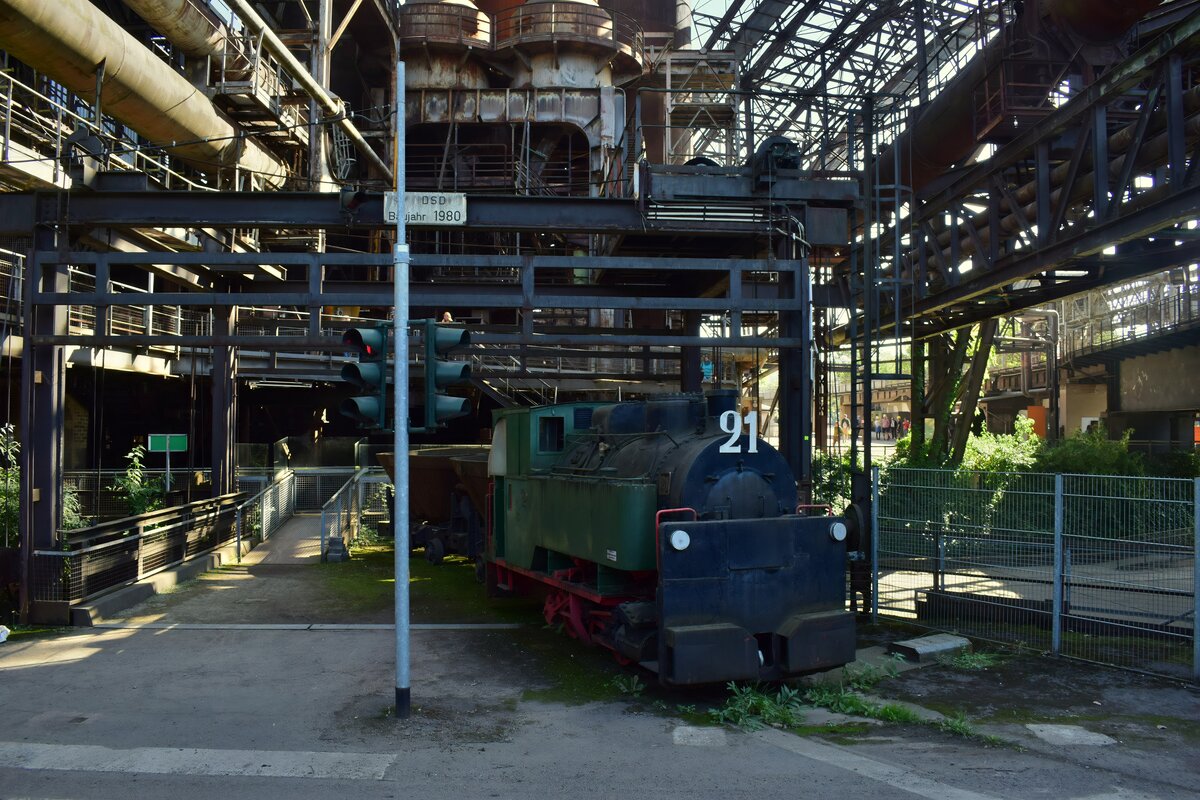 In den Anfangsjahren der Völklinger Hütte besaß das Werk eine eingene Schmalspurbahn. Ausgestellt ist hier die Lok 21 von 1903. Sie wurde eingesetzt um die Schlacke von den Hochöfen wegzufahren.