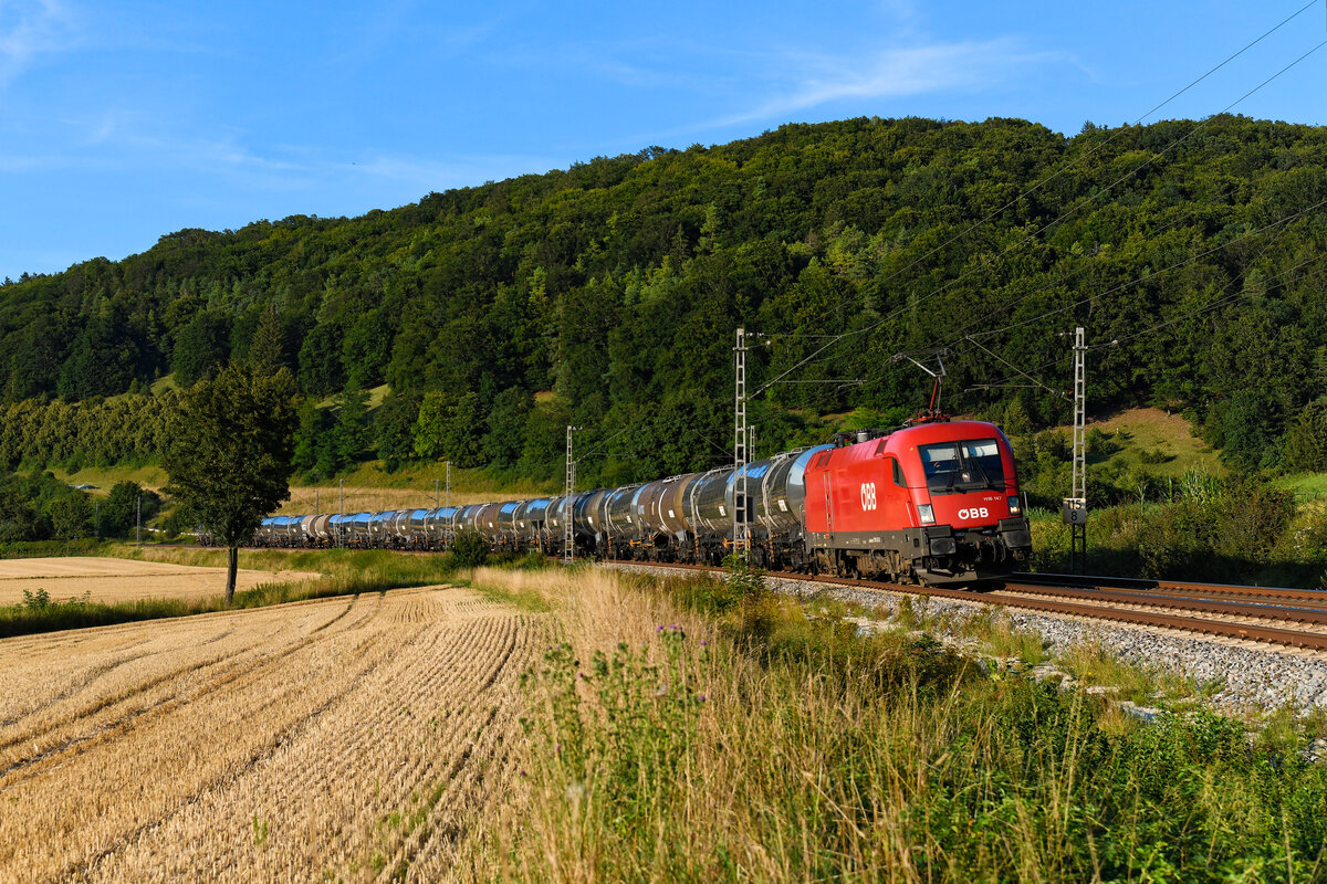 Mit einem zum größten Teil aus neuen Chemiekesselwagen bestehenden Ganzzug war am Abend des 06. August 2021 die 1116.147 in Richtung Norden unterwegs. Zwischen Breitenfurt und Dollnstein gelang eine Aufnahme.