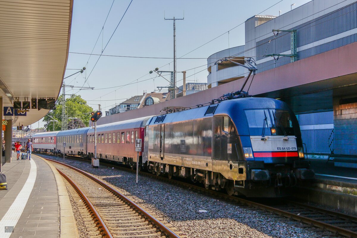 MRCE 182 519/ES 64 U2-019 mit Urlaubsexpress in Düsseldorf Hbf, Juli 2018.