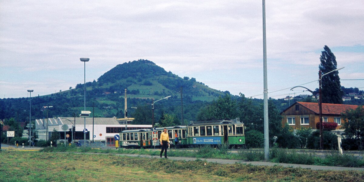 Vor 50 Jahren__Die Straßenbahn in Reutlingen verkehrte das letzte Mal am 19. Oktober 1974. Ausrückender Zug der Linie 2 von Eningen mit Tw 35 [ME 1929; 1962 ex SSB 259; heute als SSF 15* im Straßenbahnmuseum] und zwei Bw in Richtung Südbhf. unterwegs. Im Hintergrund Ausläufer der Schwäbischen Alb mit 759 Meter hohem Drackenberg.__29-07-1974