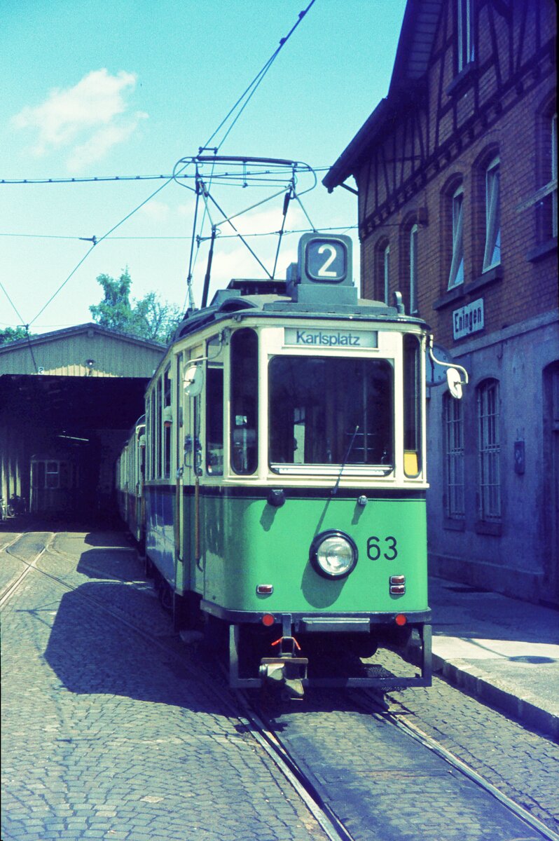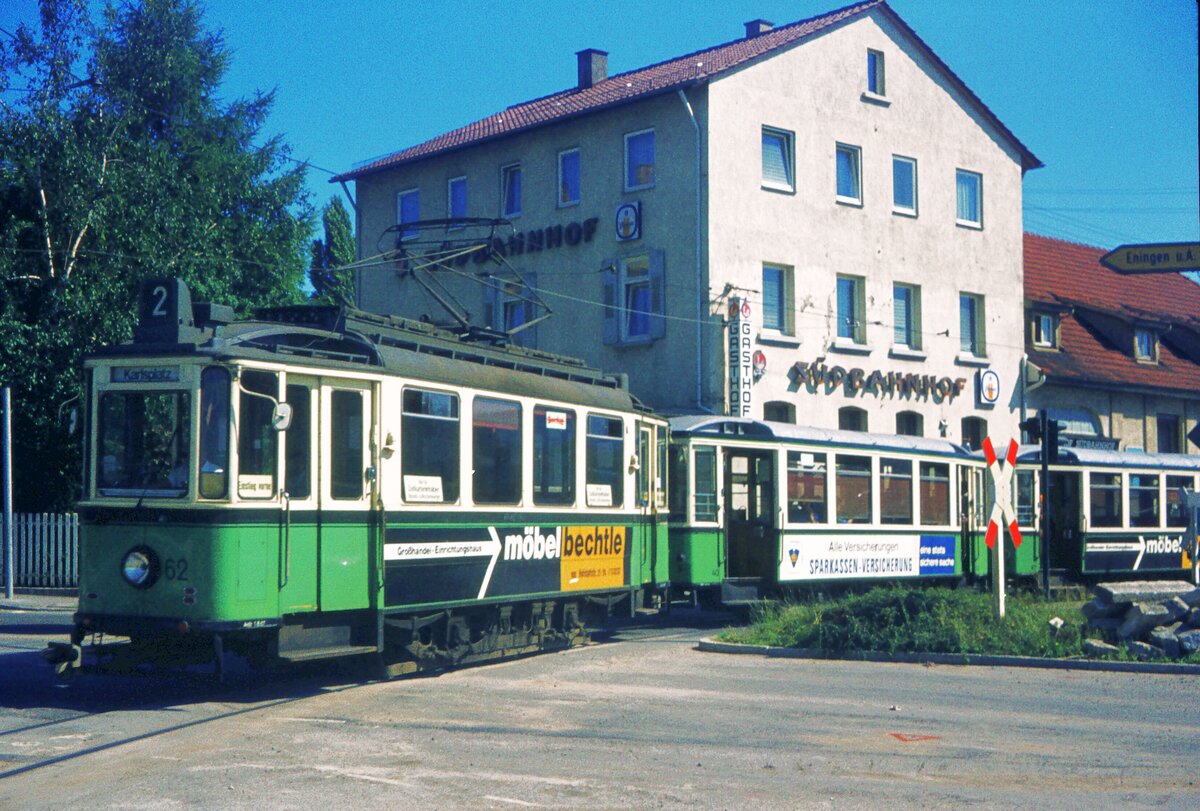 Vor 50 Jahren__Die Straßenbahn in Reutlingen verkehrte das letzte Mal am 19. Oktober 1974. 3-Wagen-Zug der Linie 2 nach Reutlingen mit Tw 62 [ME 1950; 1966 ex SSB 298] im Bf Eningen auf Gleis 1.__05-09-1974