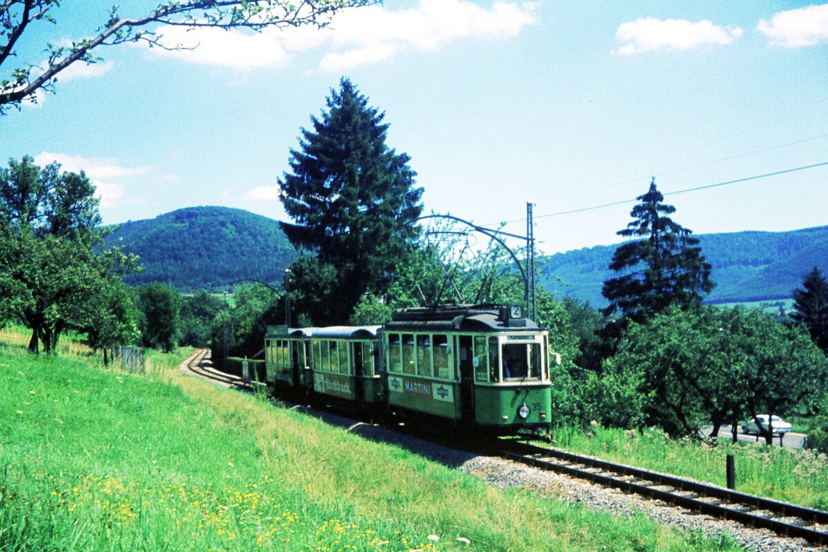 Vor 50 Jahren__Die Straßenbahn in Reutlingen verkehrte das letzte Mal am 19. Oktober 1974. Ausrückender Zug der Linie 2 von Eningen mit Tw 62 [ME 1950; 1966 ex SSB 298] und zwei Bw kurz hinter Eningen beim früheren Abzweig zur Spinnerei.__29-07-1974