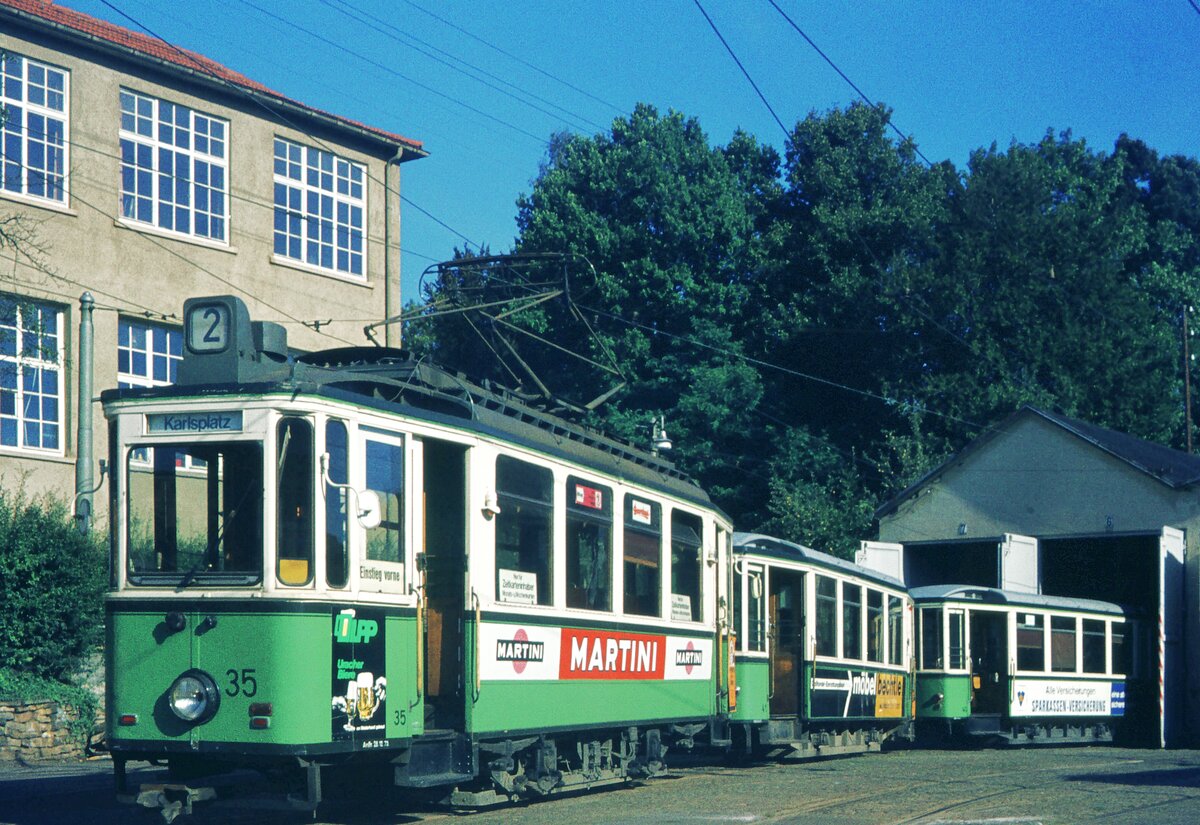 Vor 50 Jahren__Die Straßenbahn in Reutlingen verkehrte das letzte Mal am 19. Oktober 1974. Tw 35 [ME 1929; 1962 ex SSB 259; heute als SSF 15* im Straßenbahnmuseum] mit zwei Bw auf Linie 2 im Bf Eningen.__29-07-1974
