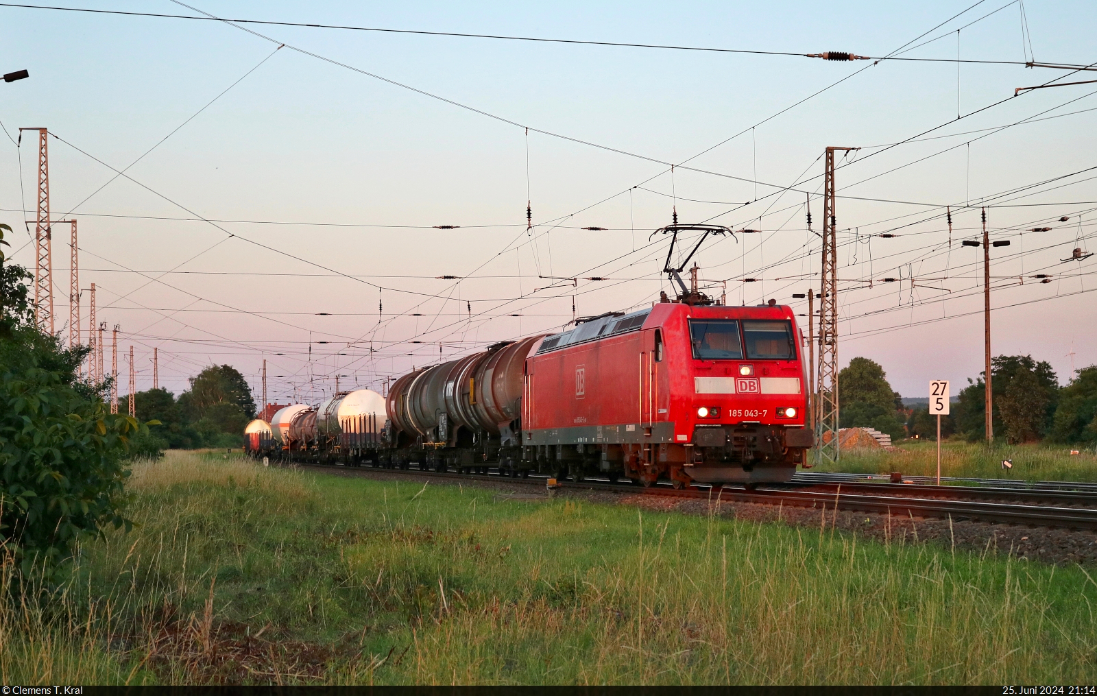 185 043-7 zieht zu späterer Stunde eine bunte Mischung aus Kessel- und Flachwagen durch den Bahnhof Röblingen am See Richtung Sangerhausen.