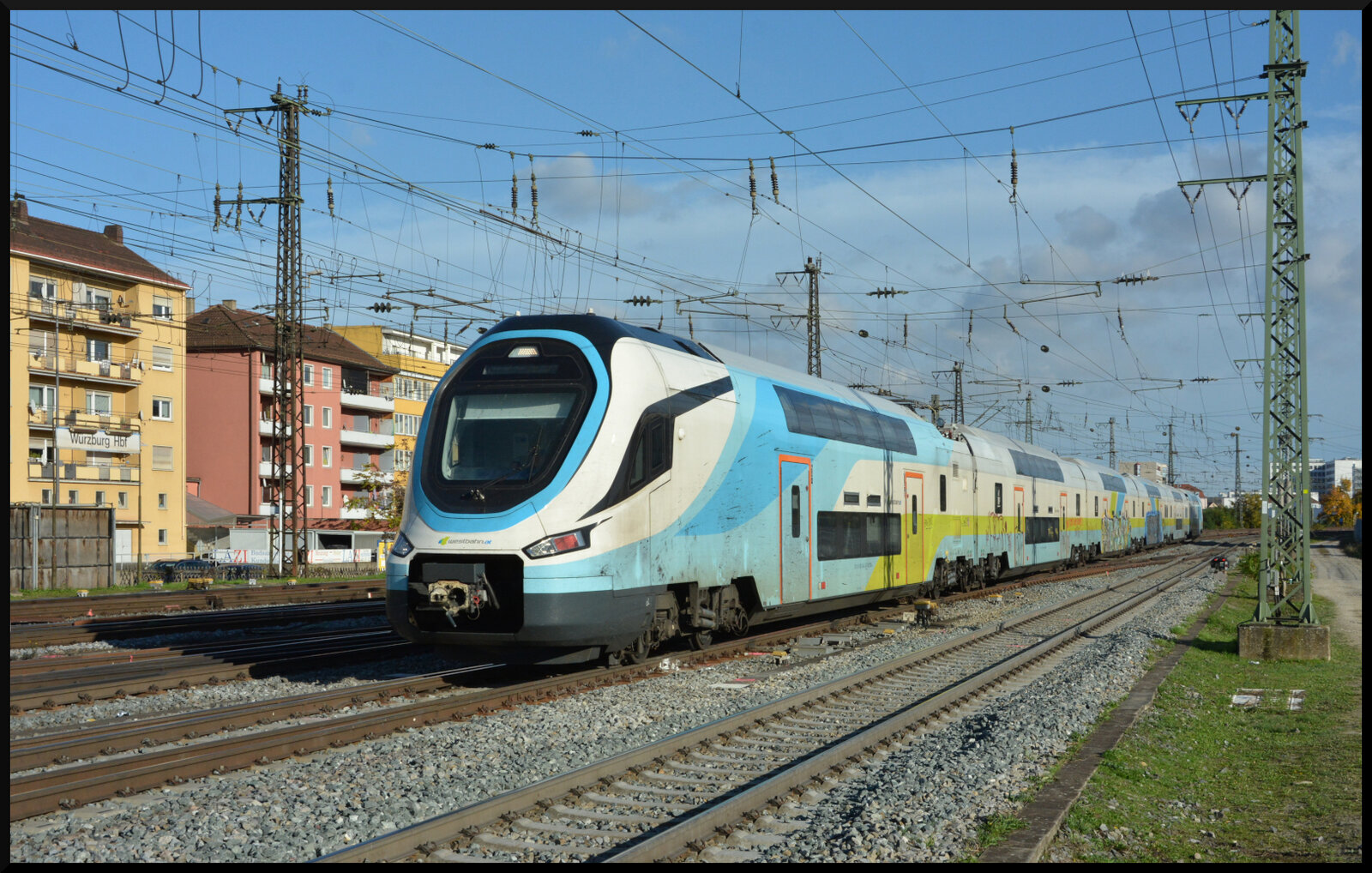 Zwei Bombardier Talent 2, angeführt von 9442 601, schlängeln sich aus dem Bahnhof Röblingen am See.