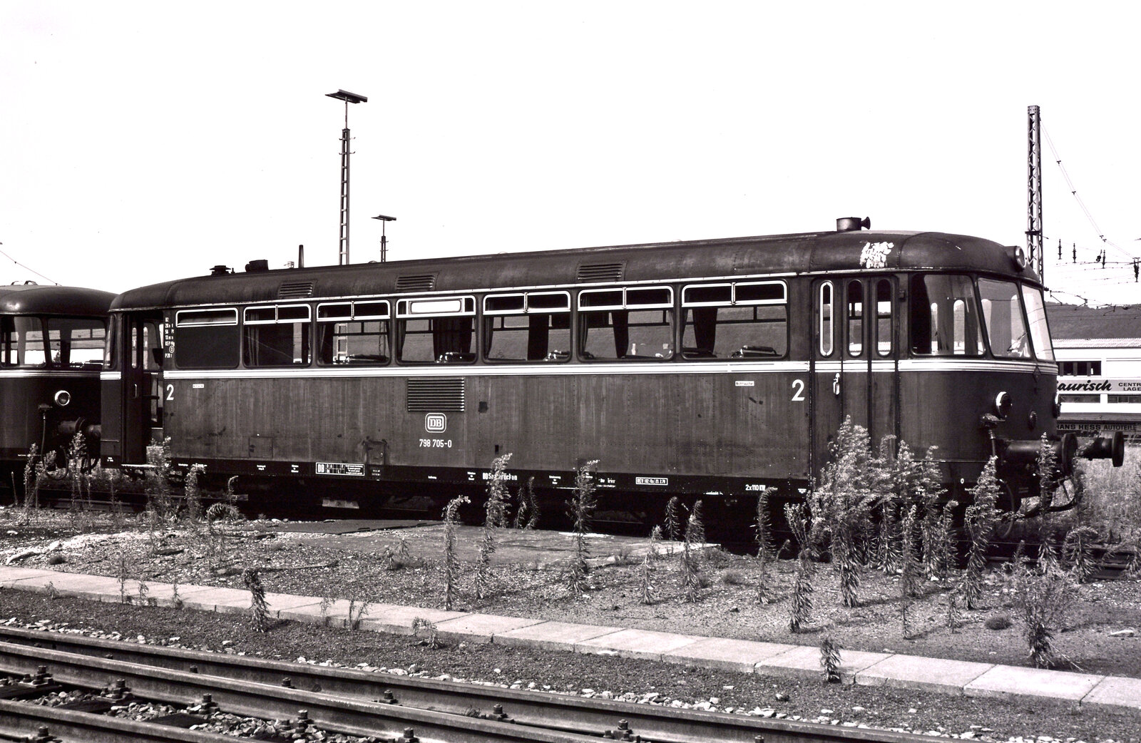 DB-Schwerkleinwagen KLV 61-9127 und daneben der Uerdinger Schienenbusbeiwagen 998 105-1 vor dem Bw Trier (DB).