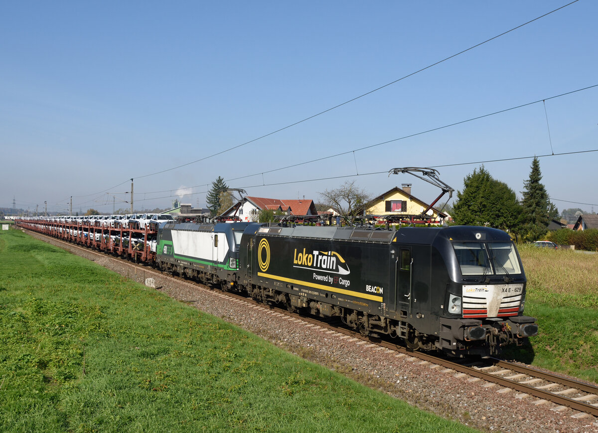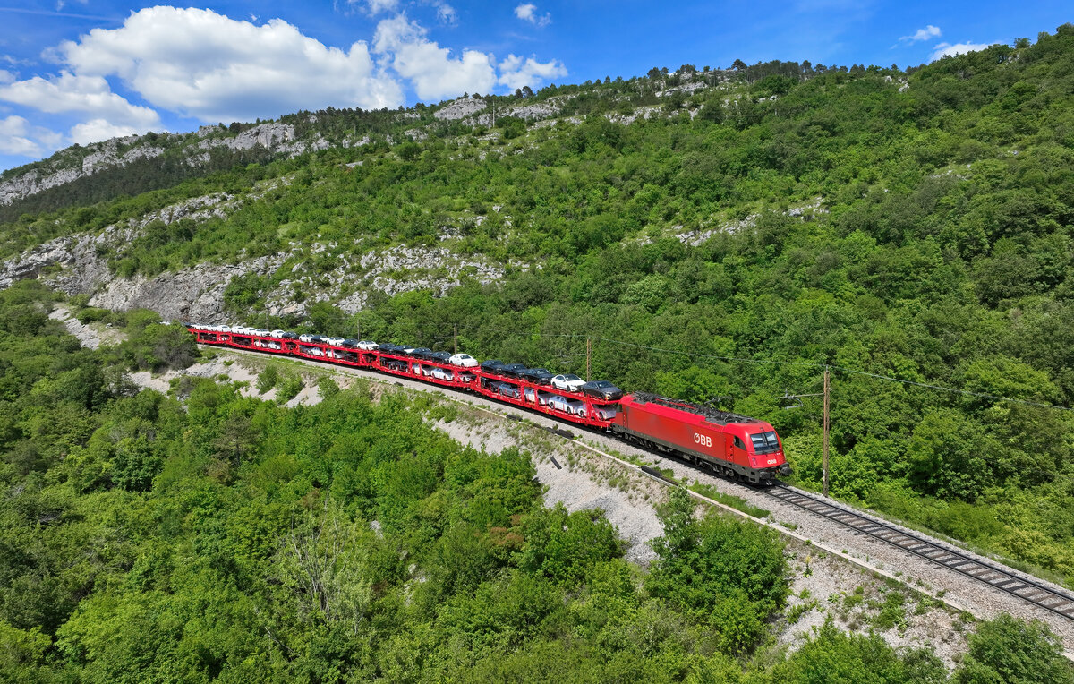 Fabriksneue Hyundai Tucson SUV's aus dem mährischen Nošovice wurden am 24. August 2024 von dem mit den Vecton Loks 193 978 und 383 204 bespannten Autozug 49505 zum Adriahafen Koper transportiert und von mir in Badl fotografiert.
